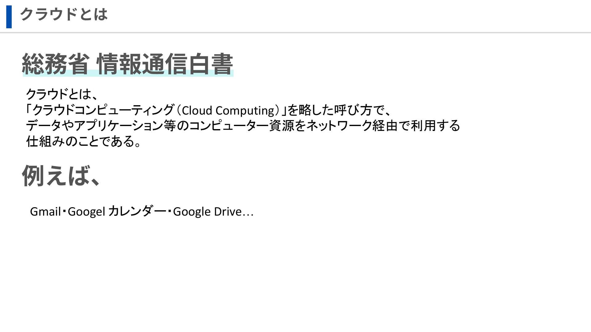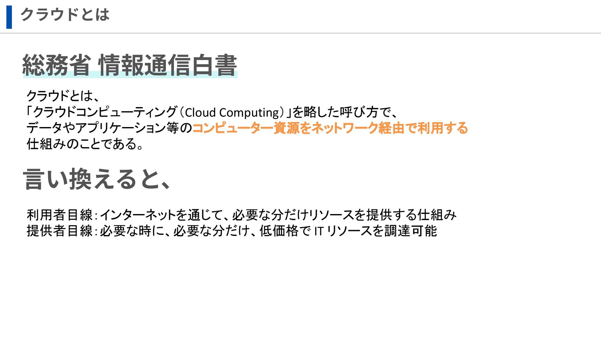 「必要な時に」「必要な分だけ」「低価格で」 利⽤できるITリソースのこと クラウドとは