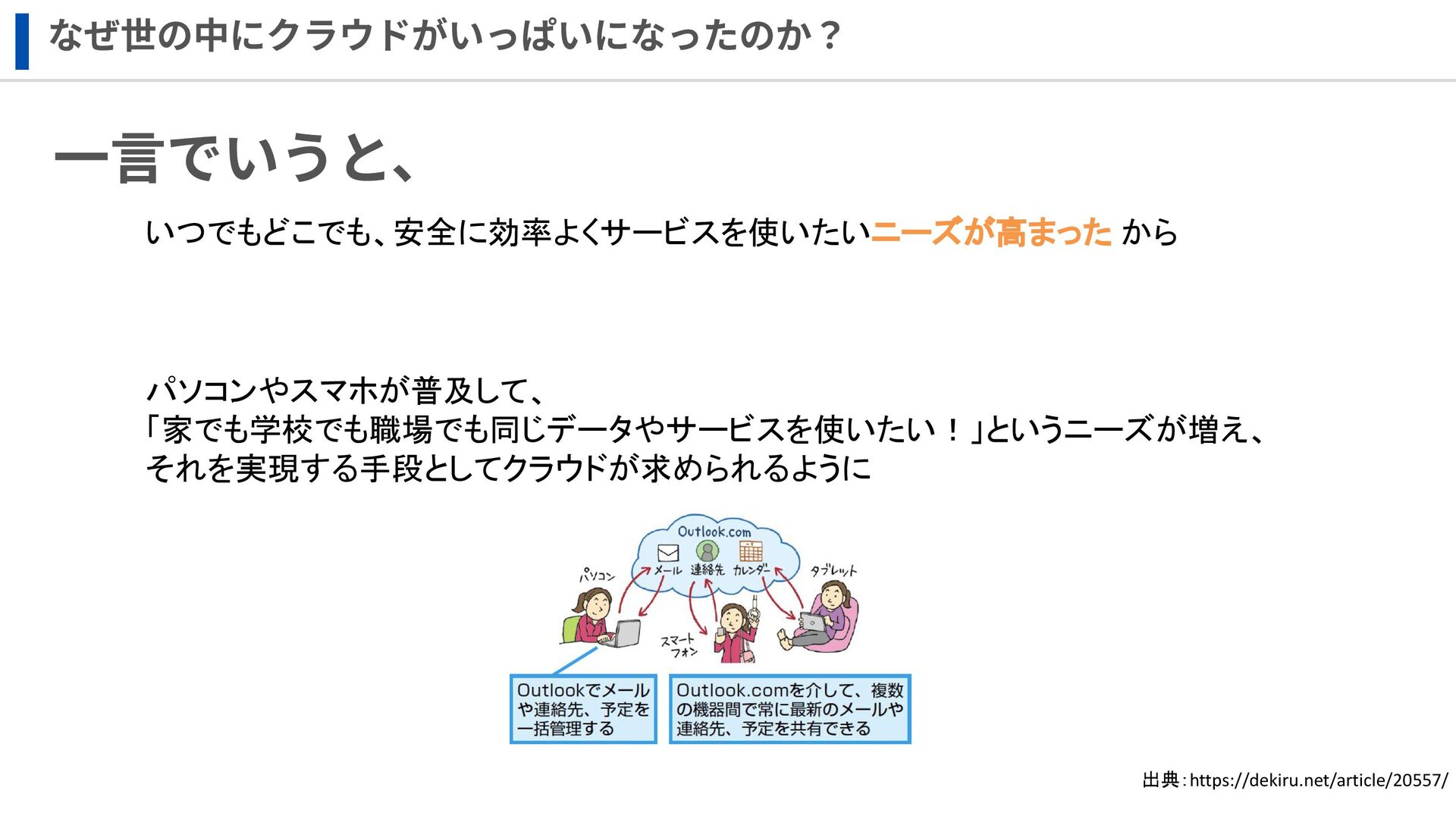 世の中がクラウドでいっぱいになるまで 2007年 Google CEOによる「クラウド」への⾔及 Google CEO エリック・シュミット氏 「データサービスやアーキテクチャは雲のような存在 であるサーバー上に存在し、 ブラウザやアクセス手段、デバイスによらず雲にアクセス
