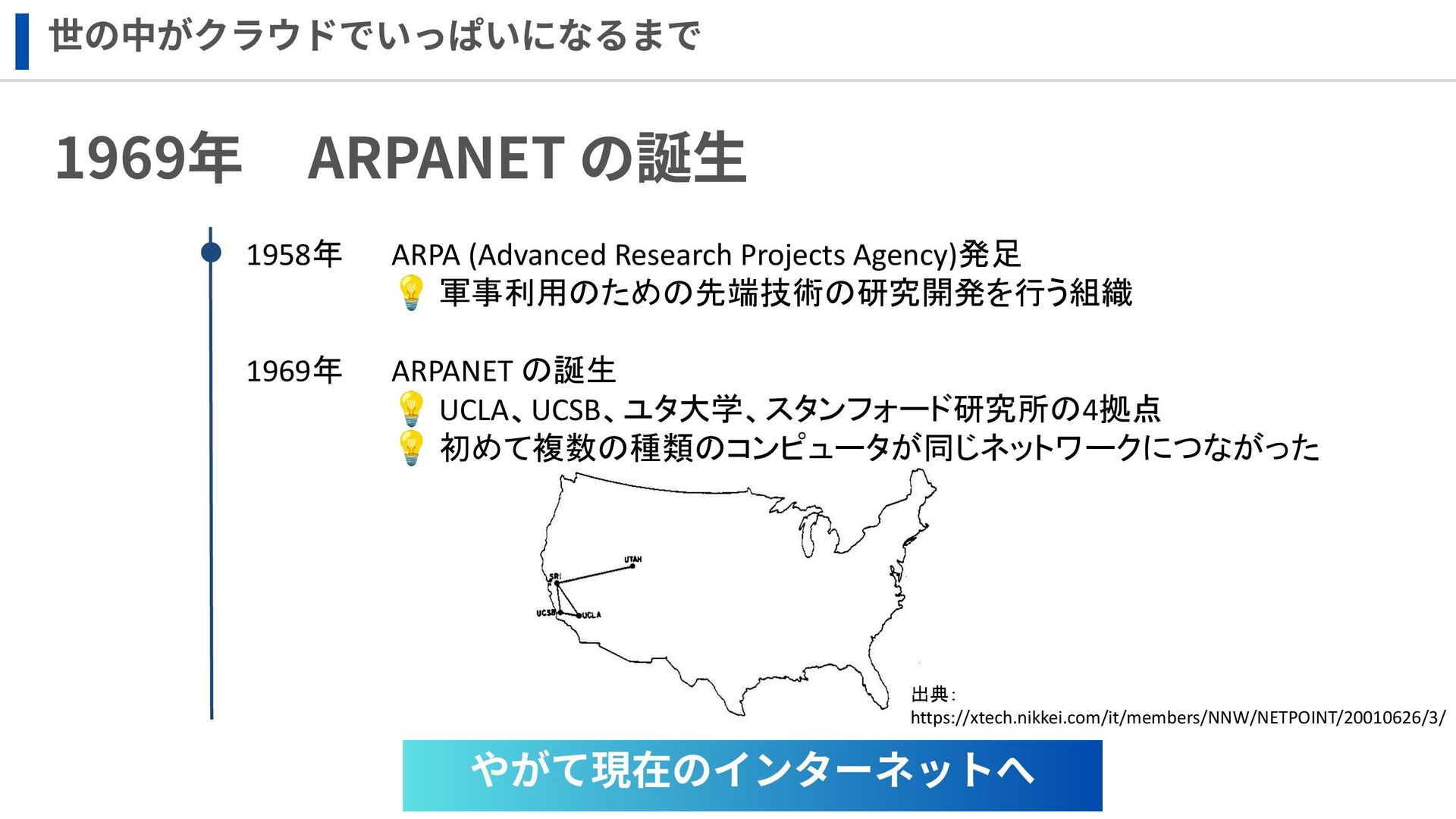 世の中がクラウドでいっぱいになるまで 1969年 ARPANET の誕⽣ 1958年 ARPA (Advanced Research Projects Agency)発足 💡