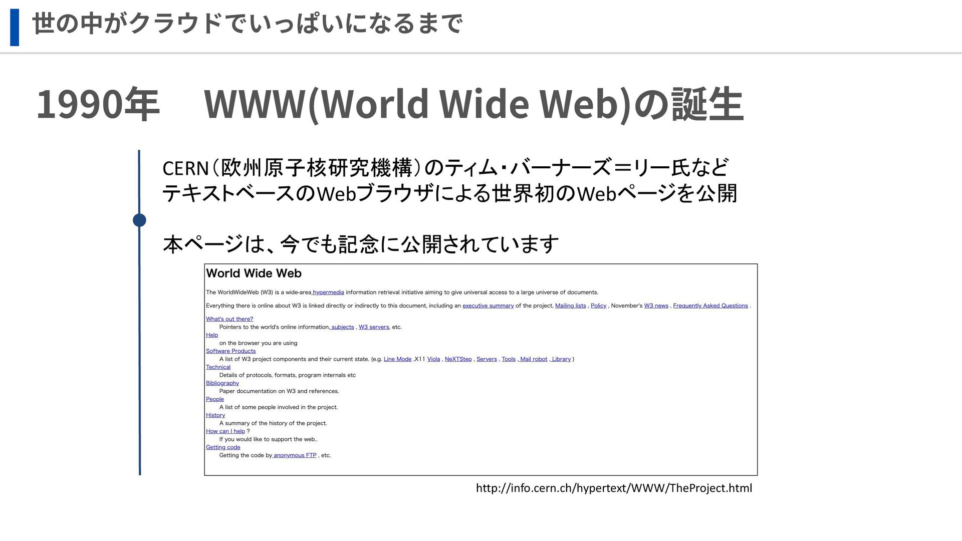 世の中がクラウドでいっぱいになるまで 1990年 WWW(World Wide Web)の誕⽣ CERN(欧州原子核研究機構)のティム・バーナーズ=リー氏など テキストベースのWebブラウザによる世界初のWebページを公開 本ページは、今でも記念に公開されています http://info.cern.ch/hypertext/WWW/TheProject.html