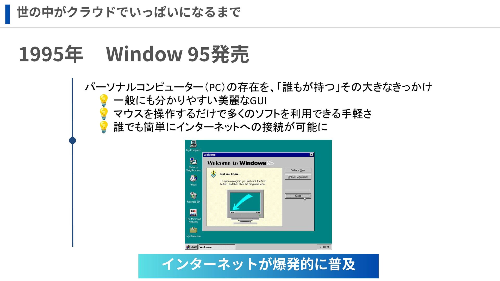 世の中がクラウドでいっぱいになるまで 1995年 Window 95発売 パーソナルコンピューター(PC)の存在を、「誰もが持つ」その大きなきっかけ 💡 一般にも分かりやすい美麗なGUI 💡 マウスを操作するだけで多くのソフトを利用できる手軽さ 💡 誰でも簡単にインターネットへの接続が可能に