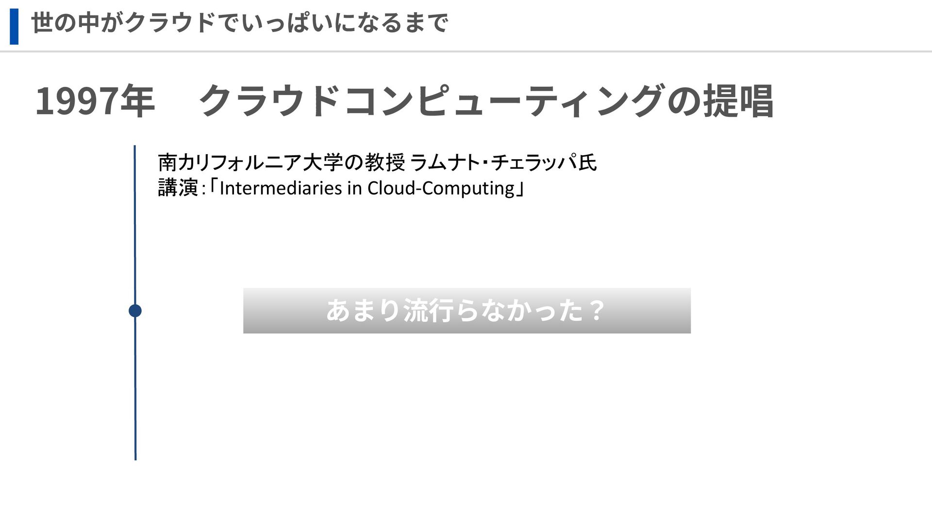世の中がクラウドでいっぱいになるまで 1997年 クラウドコンピューティングの提唱 南カリフォルニア大学の教授 ラムナト・チェラッパ氏 講演:「Intermediaries in Cloud-Computing」 あまり流⾏らなかった?