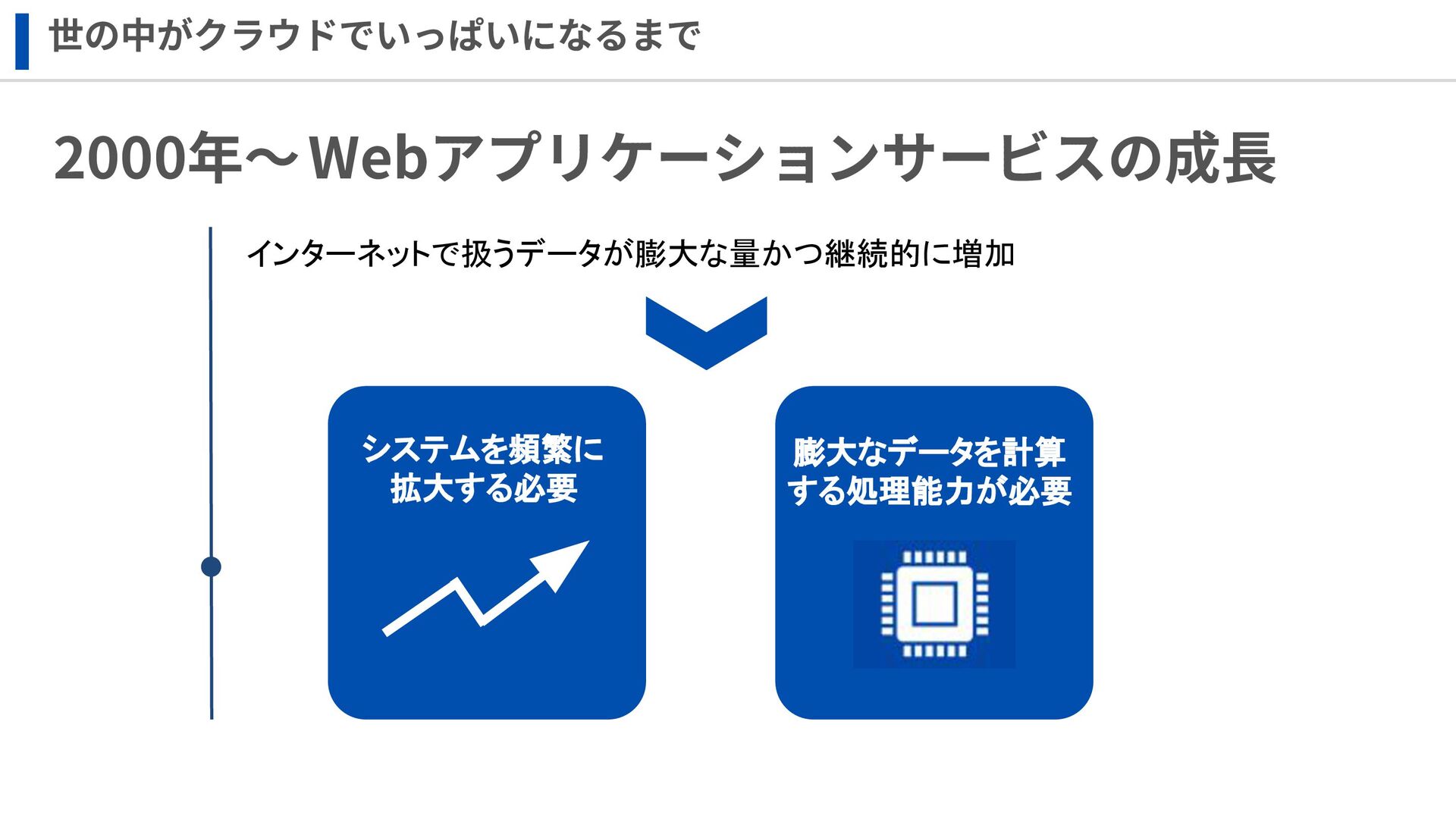 世の中がクラウドでいっぱいになるまで 2000年〜Webアプリケーションサービスの成⻑ インターネットで扱うデータが膨大な量かつ継続的に増加 システムを頻繁に 拡大する必要 膨大なデータを計算 する処理能力が必要