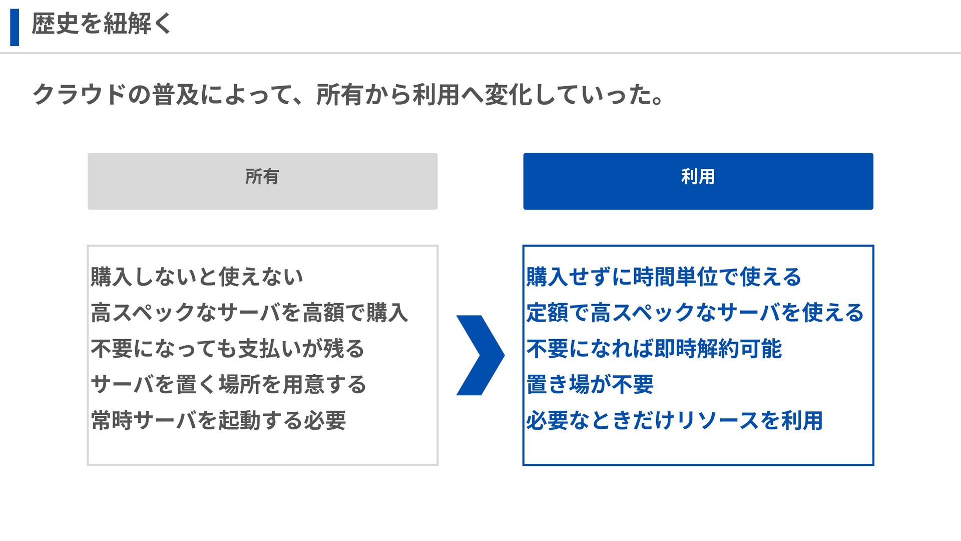 歴史を紐解く 所有 利⽤ 購⼊しないと使えない ⾼スペックなサーバを⾼額で購⼊ 不要になっても⽀払いが残る サーバを置く場所を⽤意する 常時サーバを起動する必要 購⼊せずに時間単位で使える 定額で⾼スペックなサーバを使える