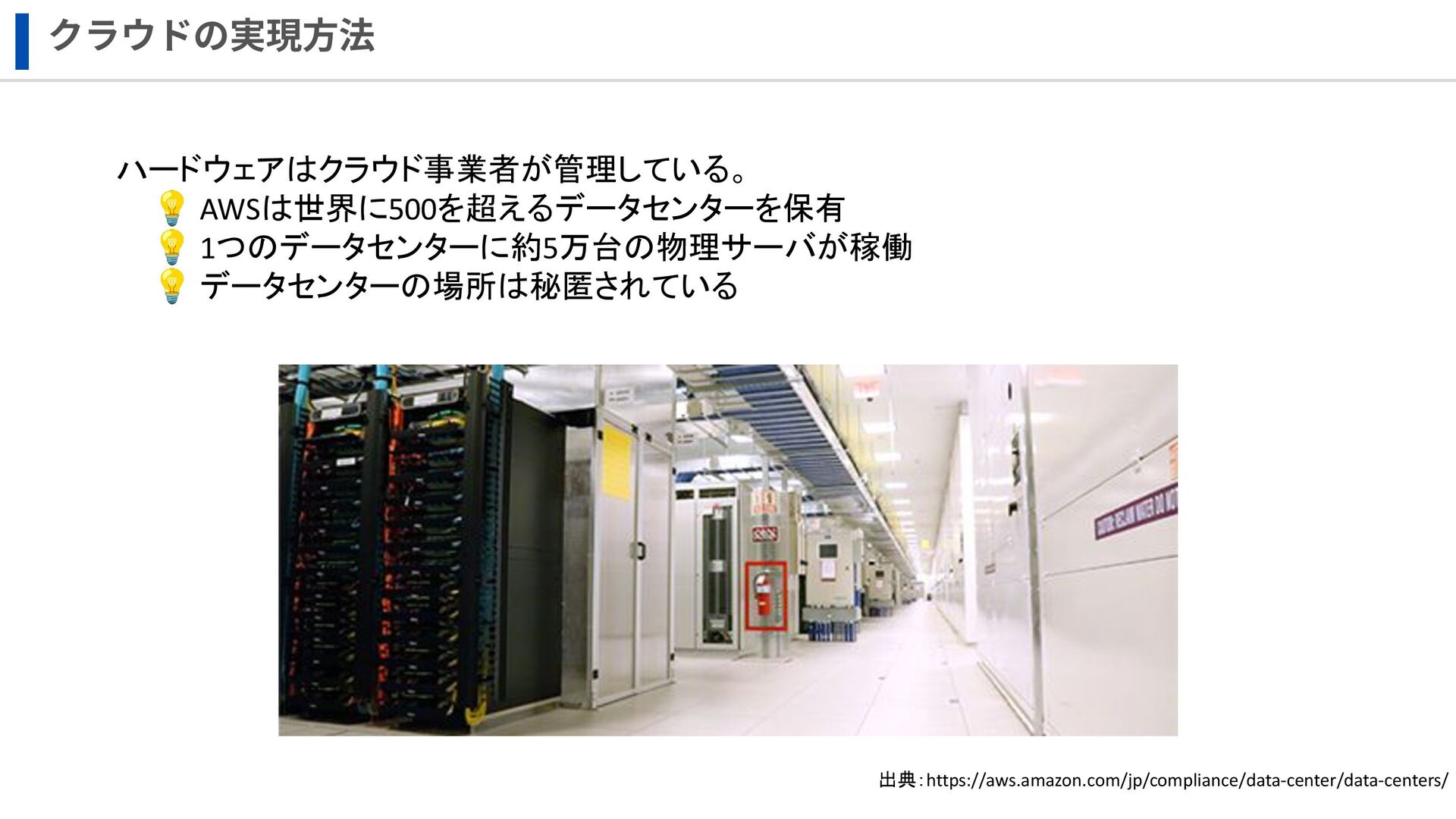 クラウドの実現⽅法 ハードウェアはクラウド事業者が管理している。 💡 AWSは世界に500を超えるデータセンターを保有 💡 1つのデータセンターに約5万台の物理サーバが稼働 💡 データセンターの場所は秘匿されている 出典:https://aws.amazon.com/jp/compliance/data-center/data-centers/