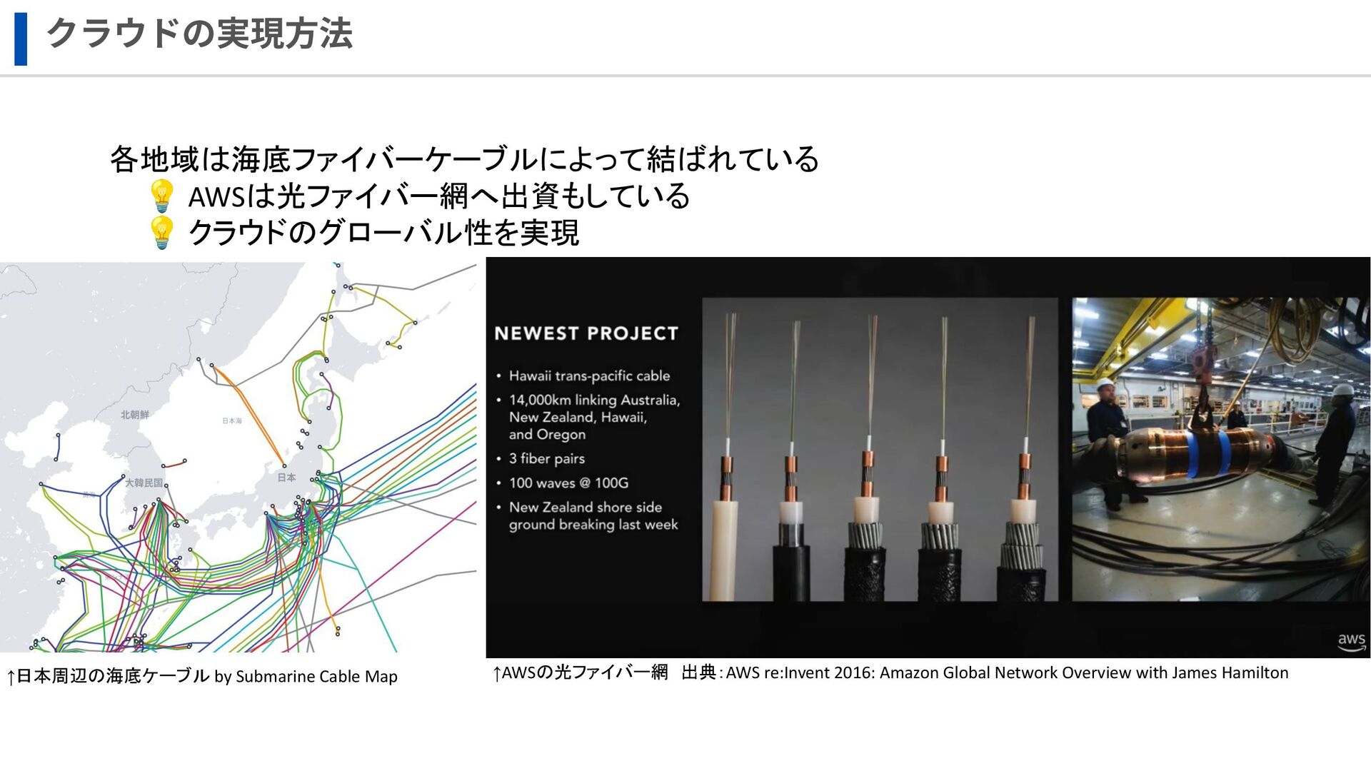 クラウドの実現⽅法 各地域は海底ファイバーケーブルによって結ばれている 💡 AWSは光ファイバー網へ出資もしている 💡 クラウドのグローバル性を実現 ↑AWSの光ファイバー網 出典:AWS re:Invent 2016: Amazon