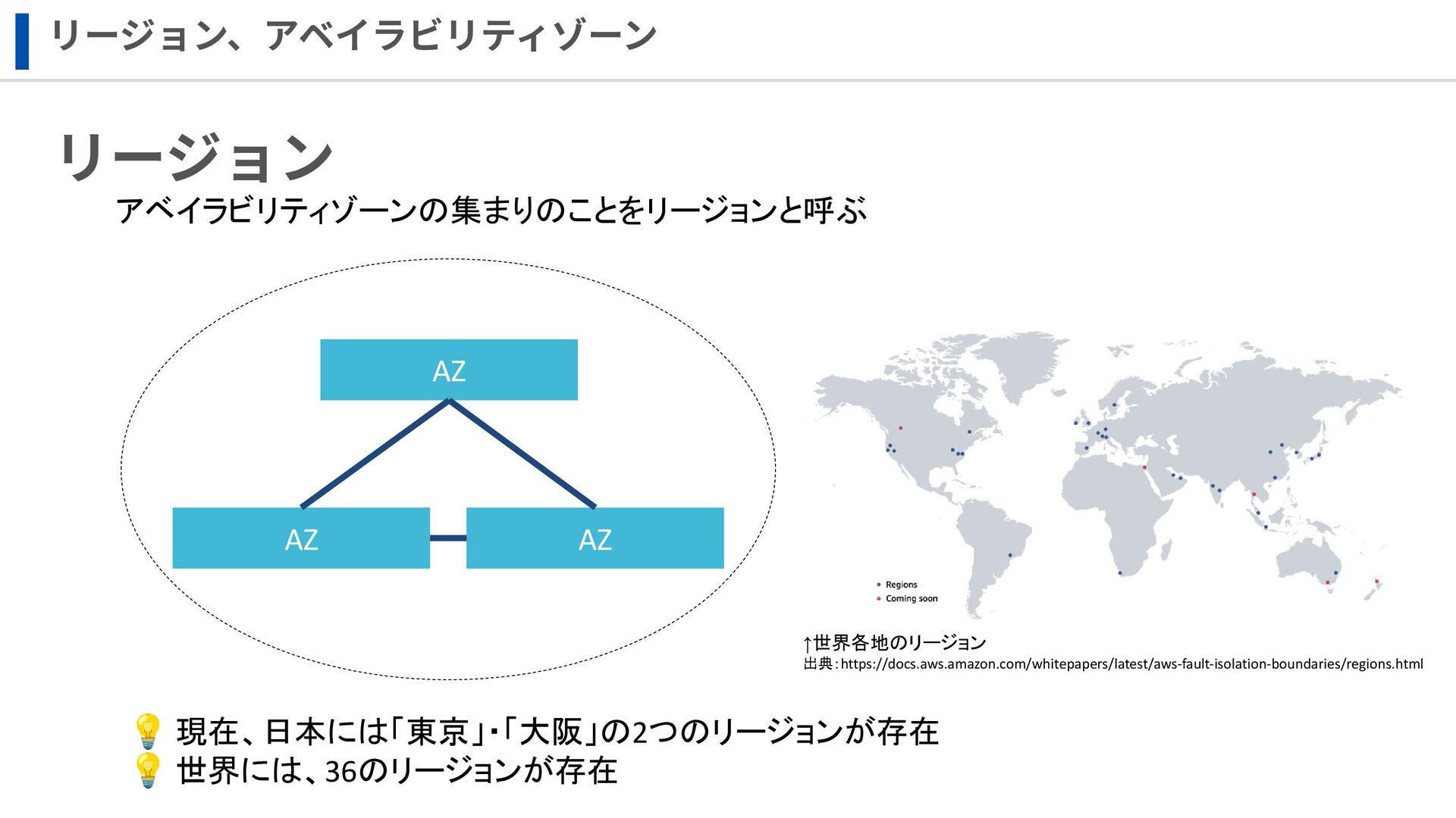 リージョン、アベイラビリティゾーン アベイラビリティゾーンの集まりのことをリージョンと呼ぶ リージョン AZ AZ AZ 💡 現在、日本には「東京」・「大阪」の2つのリージョンが存在 💡 世界には、36のリージョンが存在