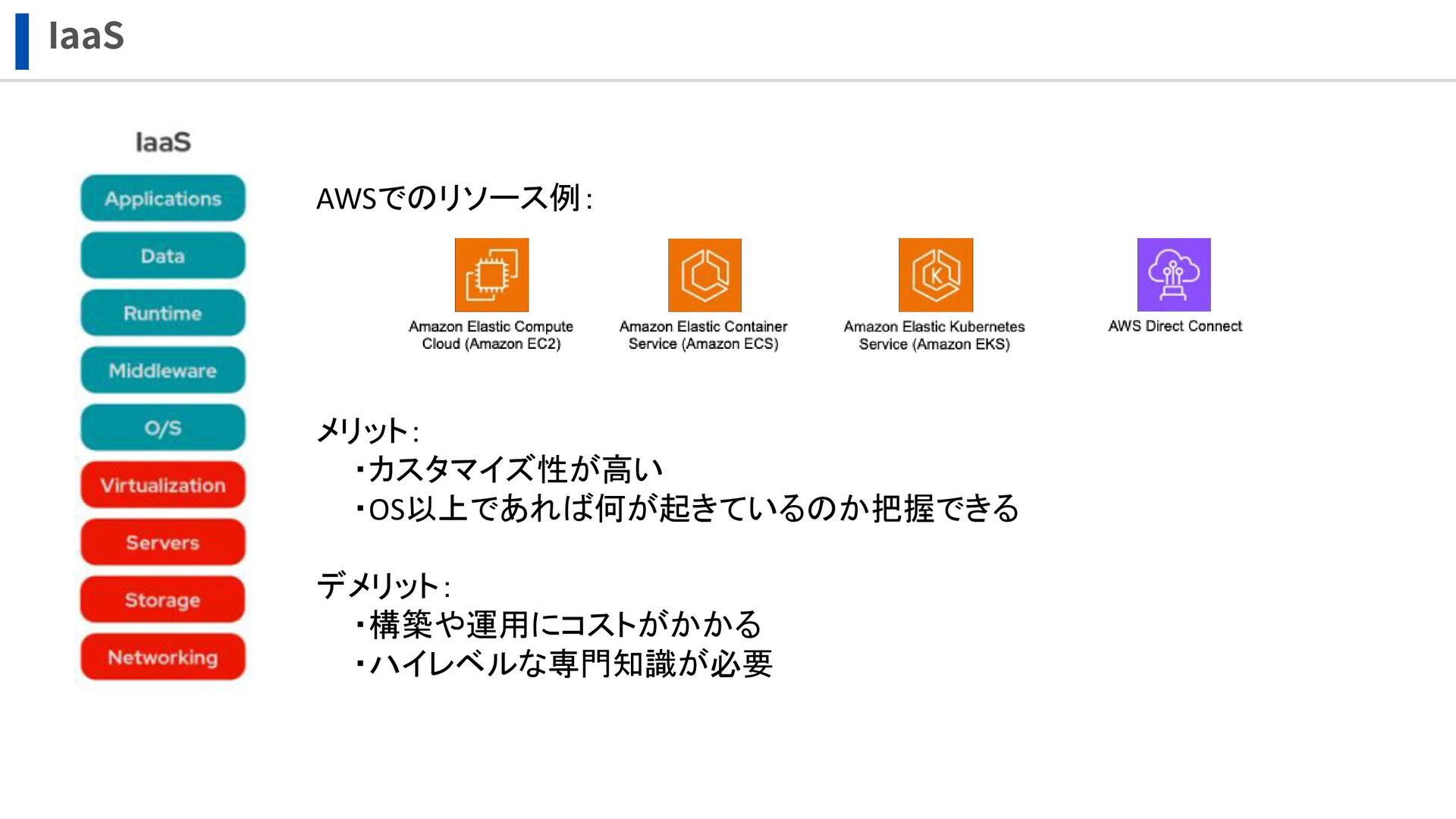 IaaS AWSでのリソース例: メリット: ・カスタマイズ性が高い ・OS以上であれば何が起きているのか把握できる デメリット: ・構築や運用にコストがかかる ・ハイレベルな専門知識が必要