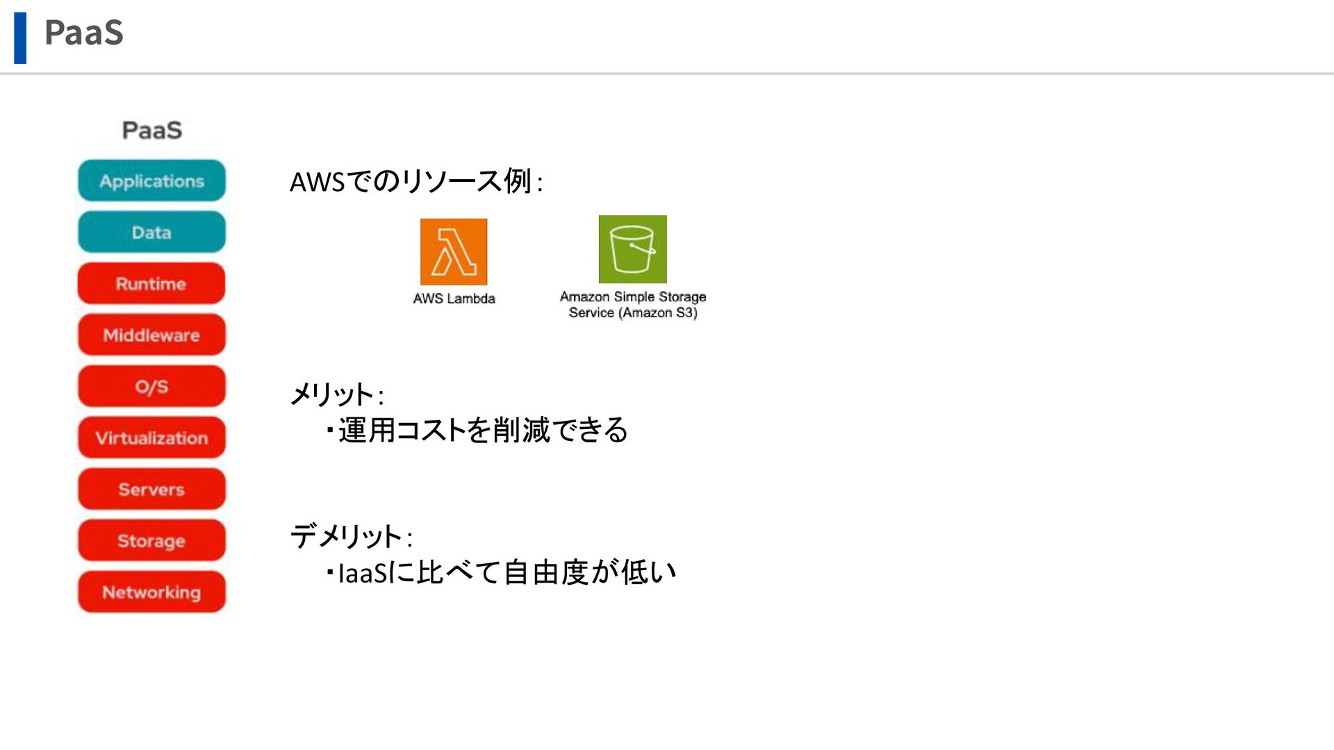 PaaS AWSでのリソース例: メリット: ・運用コストを削減できる デメリット: ・IaaSに比べて自由度が低い