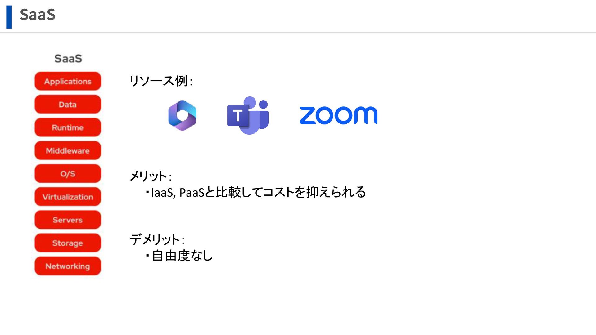 SaaS リソース例: メリット: ・IaaS, PaaSと比較してコストを抑えられる デメリット: ・自由度なし