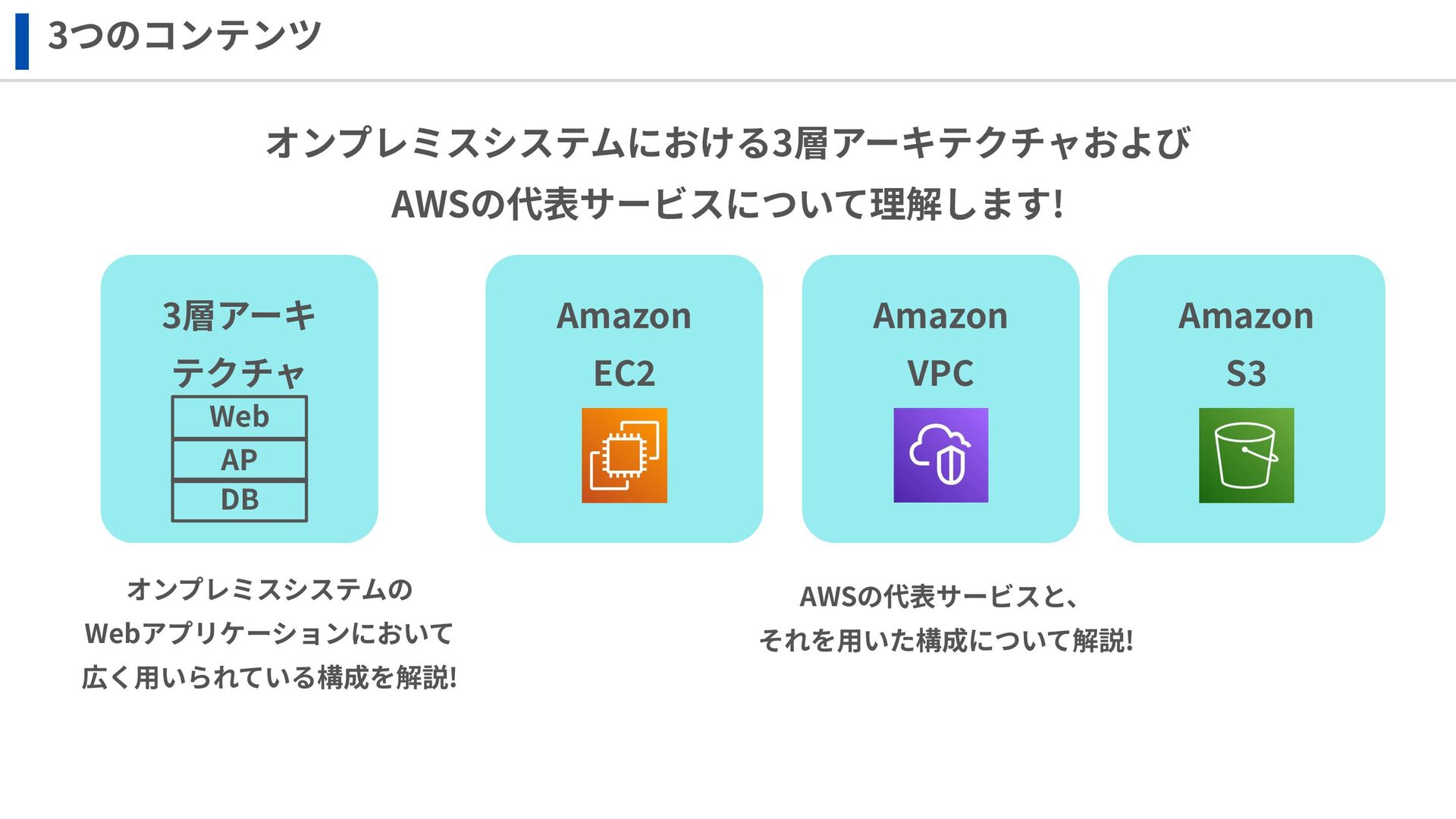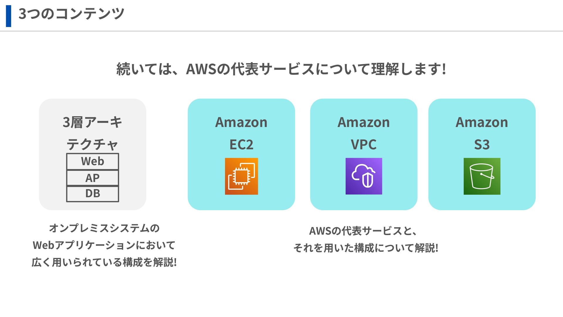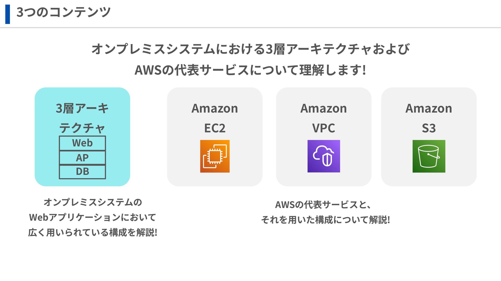 3つのコンテンツ 続いては、AWSの代表サービスについて理解します! 3層アーキ テクチャ オンプレミスシステムの Webアプリケーションにおいて 広く⽤いられている構成を解説! Web AP DB