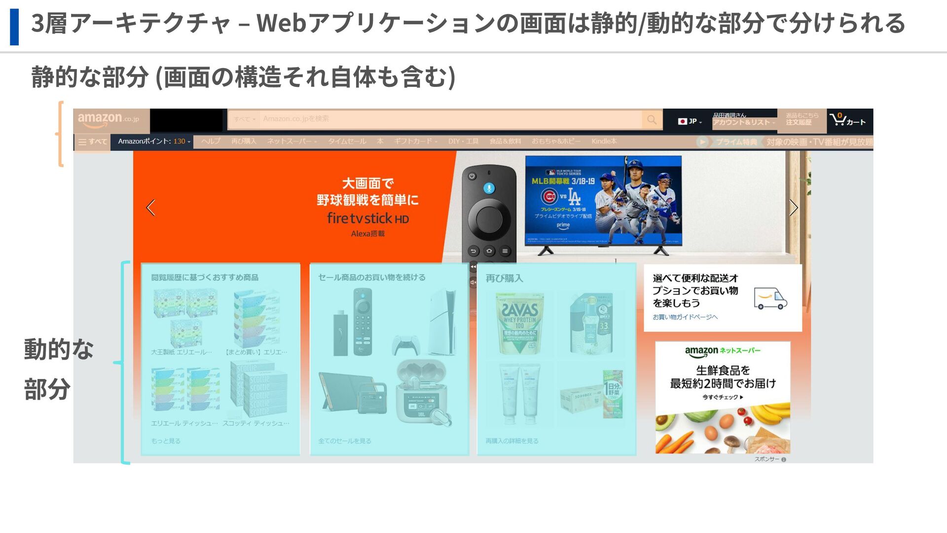 3層アーキテクチャ ‒ Webアプリケーションの画⾯は静的/動的な部分で分けられる 静的な部分 (画⾯の構造それ⾃体も含む) 動的な 部分