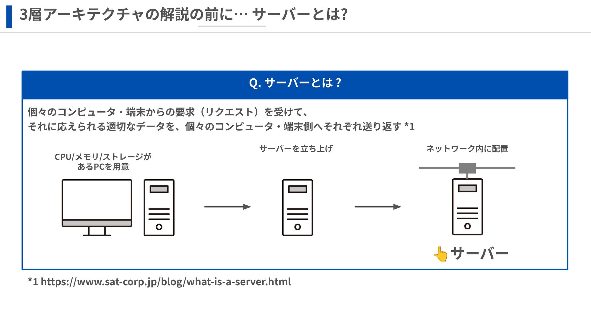 3層アーキテクチャの解説の前に… サーバーとは? Q. サーバーとは ? 個々のコンピュータ‧端末からの要求(リクエスト)を受けて、 それに応えられる適切なデータを、個々のコンピュータ‧端末側へそれぞれ送り返す *1 *1 https://www.sat-corp.jp/blog/what-is-a-server.html