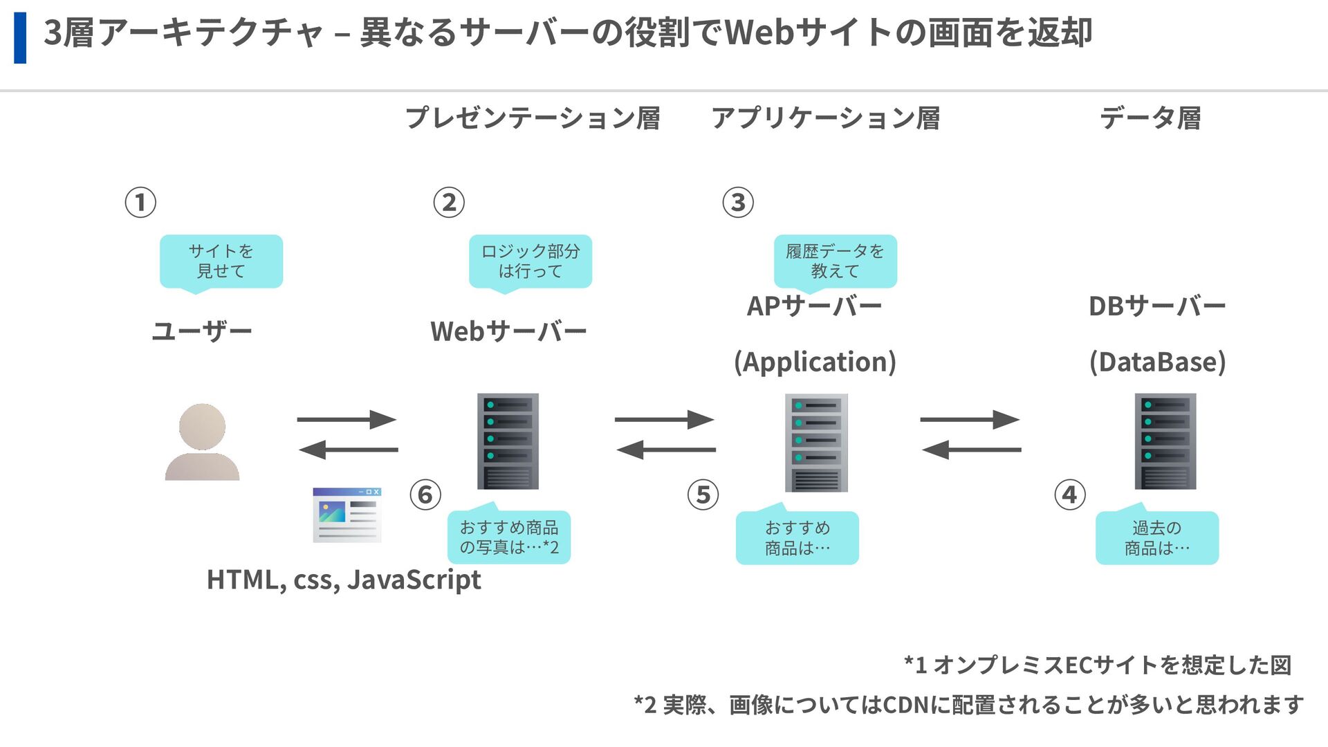 APサーバー (Application) DBサーバー (DataBase) サイトを ⾒せて ロジック部分 は⾏って 履歴データを 教えて 過去の 商品は… おすすめ 商品は… おすすめ商品 の写真は…*2 ① ② ③ ④ ⑤ ⑥ *2 実際、画像についてはCDNに配置されることが多いと思われます プレゼンテーション層 アプリケーション層 データ層