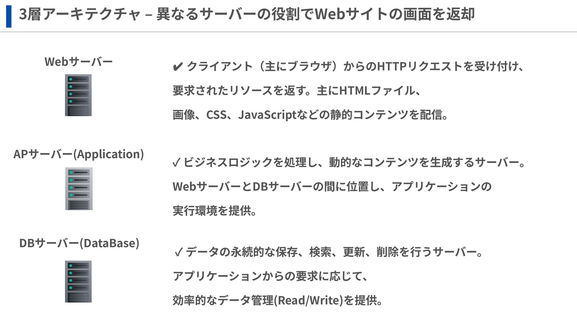 3層アーキテクチャ ‒ 異なるサーバーの役割でWebサイトの画⾯を返却 APサーバー(Application) DBサーバー(DataBase) Webサーバー ✔ クライアント(主にブラウザ)からのHTTPリクエストを受け付け、 要求されたリソースを返す。主にHTMLファイル、 画像、CSS、JavaScriptなどの静的コンテンツを配信。