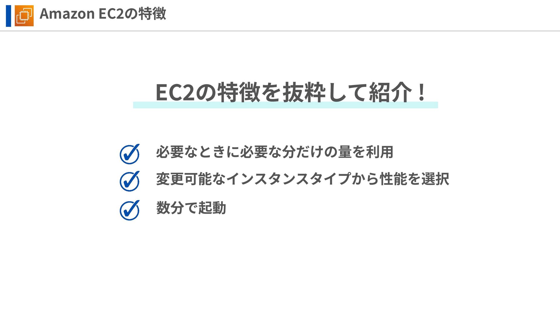 Amazon EC2の特徴 EC2の特徴を抜粋して紹介 ! 必要なときに必要な分だけの量を利⽤ 変更可能なインスタンスタイプから性能を選択 数分で起動