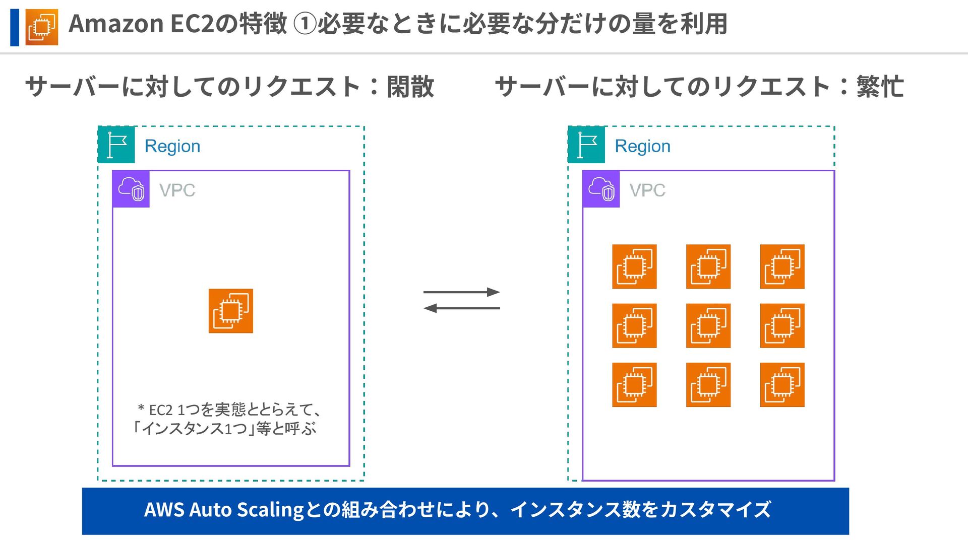 Amazon EC2の特徴 ①必要なときに必要な分だけの量を利⽤ サーバーに対してのリクエスト:閑散 サーバーに対してのリクエスト:繁忙 AWS Auto Scalingとの組み合わせにより、インスタンス数をカスタマイズ * EC2