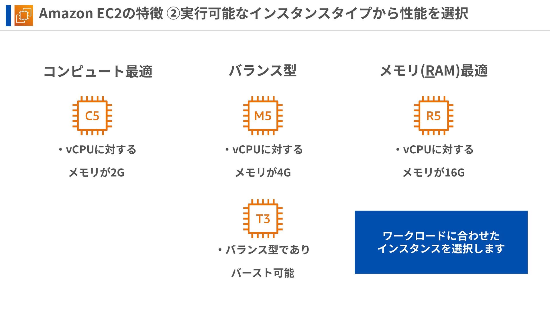 Amazon EC2の特徴 ②実⾏可能なインスタンスタイプから性能を選択 コンピュート最適 バランス型 メモリ(RAM)最適 ‧vCPUに対する メモリが4G ‧vCPUに対する メモリが2G