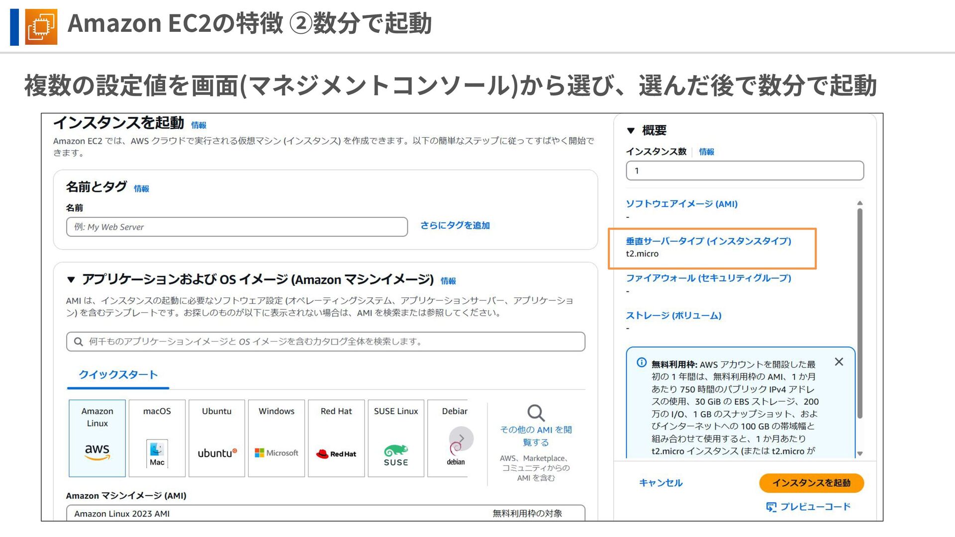 Amazon EC2の特徴 ②数分で起動 複数の設定値を画⾯(マネジメントコンソール)から選び、選んだ後で数分で起動