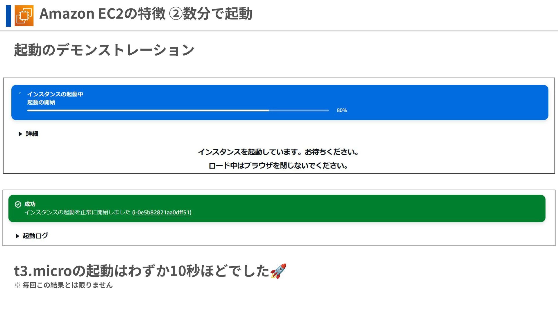 起動のデモンストレーション Amazon EC2の特徴 ②数分で起動 t3.microの起動はわずか10秒ほどでした🚀 ※ 毎回この結果とは限りません