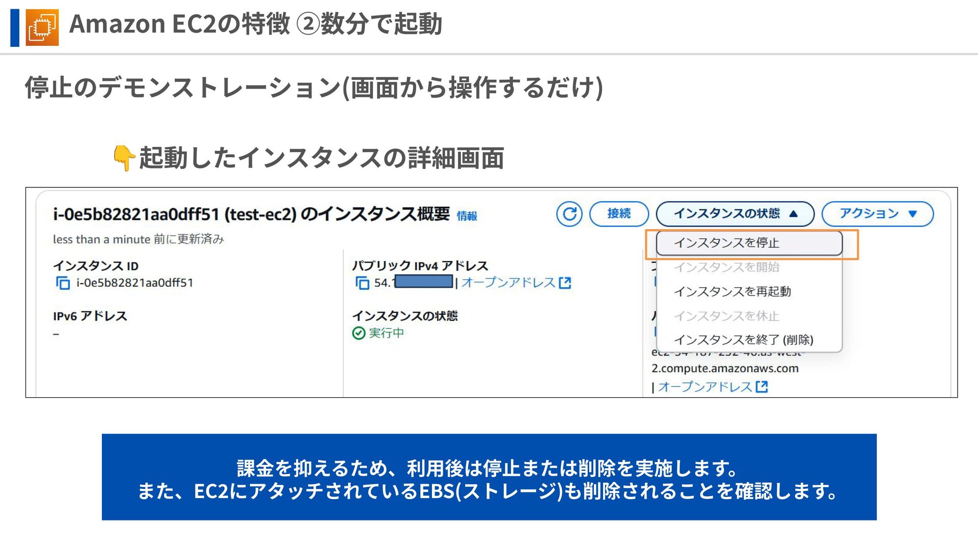 停⽌のデモンストレーション(画⾯から操作するだけ) Amazon EC2の特徴 ②数分で起動 課⾦を抑えるため、利⽤後は停⽌または削除を実施します。 また、EC2にアタッチされているEBS(ストレージ)も削除されることを確認します。 👇起動したインスタンスの詳細画⾯