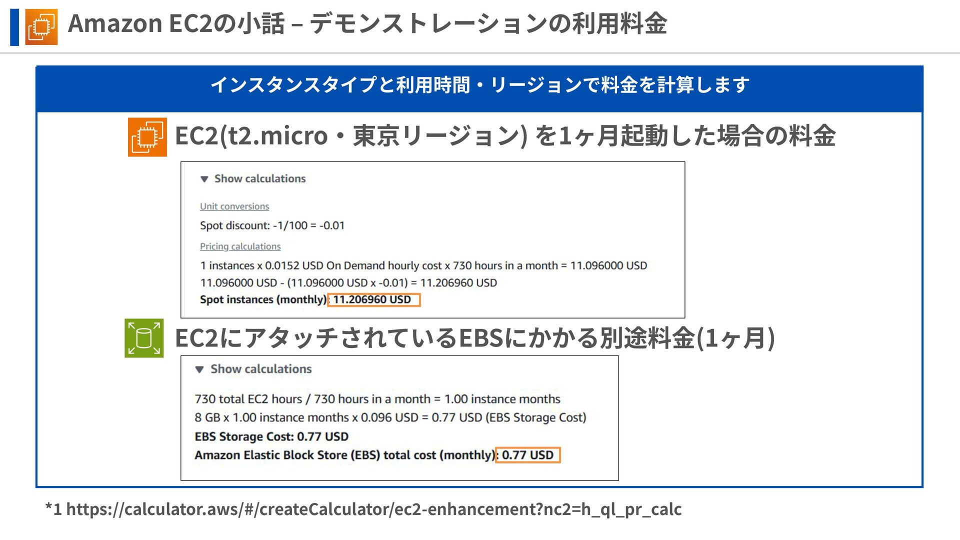 Amazon EC2の⼩話 ‒ デモンストレーションの利⽤料⾦ インスタンスタイプと利⽤時間‧リージョンで料⾦を計算します *1 https://calculator.aws/#/createCalculator/ec2-enhancement?nc2=h_ql_pr_calc EC2(t2.micro‧東京リージョン) を1ヶ⽉起動した場合の料⾦ EC2にアタッチされているEBSにかかる別途料⾦(1ヶ⽉)