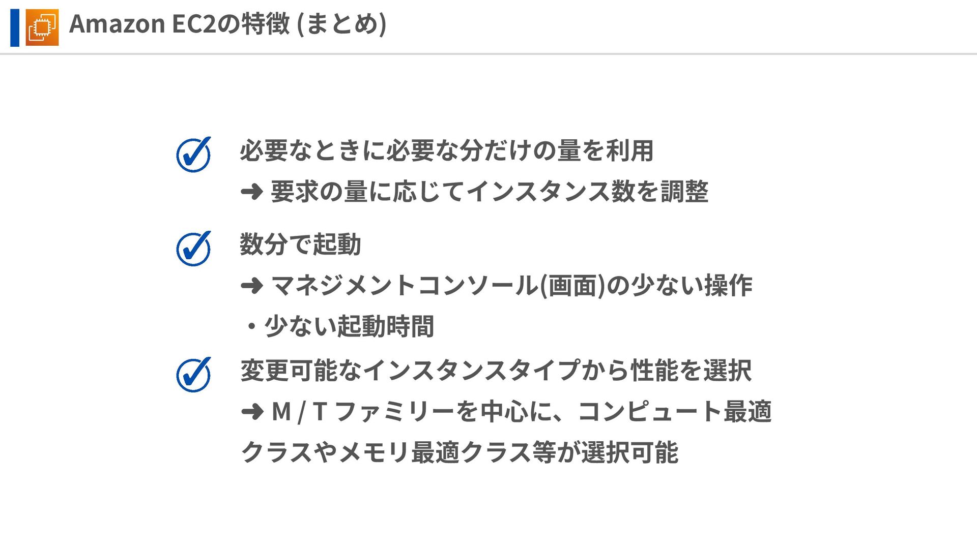 Amazon EC2の特徴 (まとめ) 必要なときに必要な分だけの量を利⽤ ➜ 要求の量に応じてインスタンス数を調整 数分で起動 ➜ マネジメントコンソール(画⾯)の少ない操作 ‧少ない起動時間