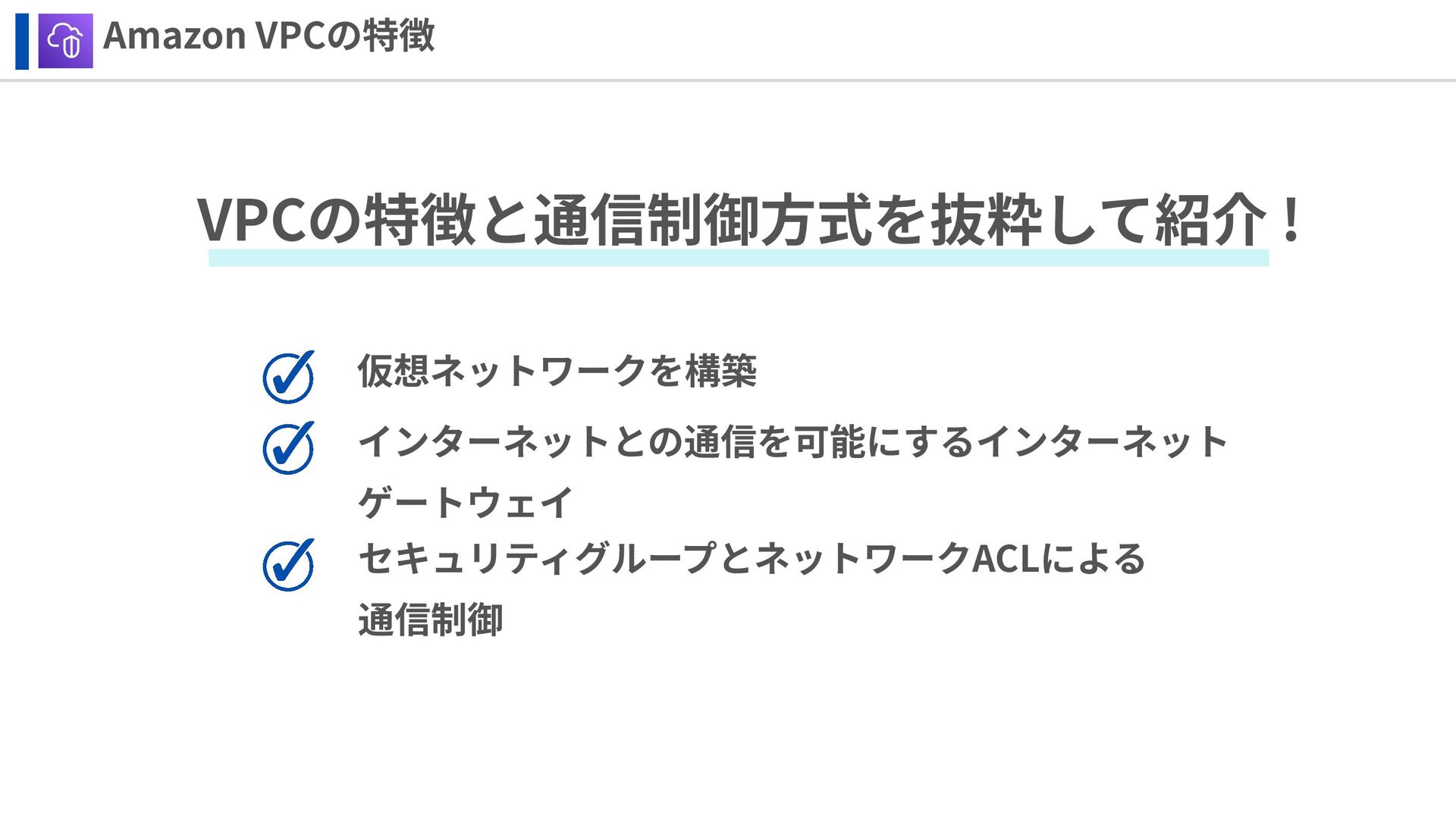 Amazon VPCの特徴 VPCの特徴と通信制御⽅式を抜粋して紹介 ! 仮想ネットワークを構築 インターネットとの通信を可能にするインターネット ゲートウェイ セキュリティグループとネットワークACLによる 通信制御