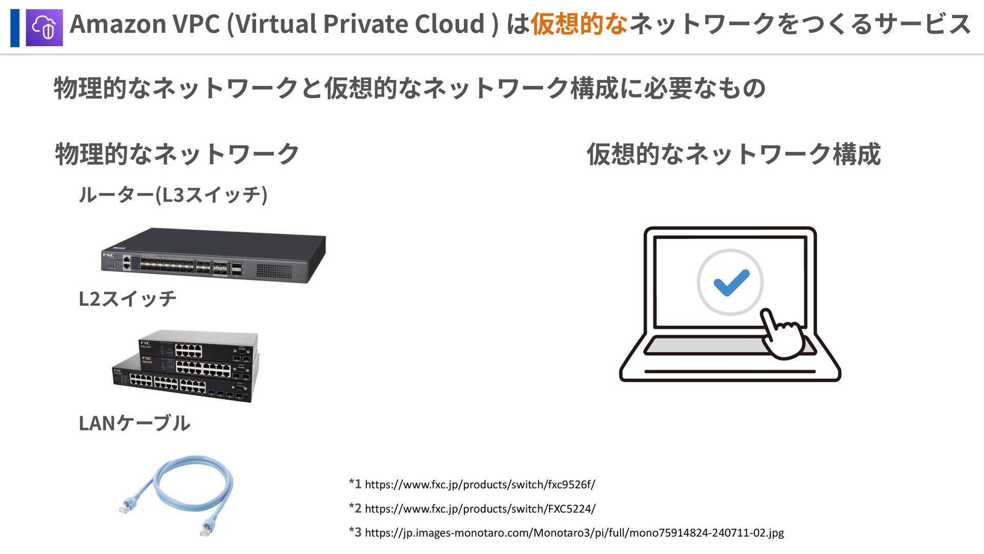 Amazon VPC (Virtual Private Cloud ) は仮想的なネットワークをつくるサービス 物理的なネットワークと仮想的なネットワーク構成に必要なもの 物理的なネットワーク 仮想的なネットワーク構成