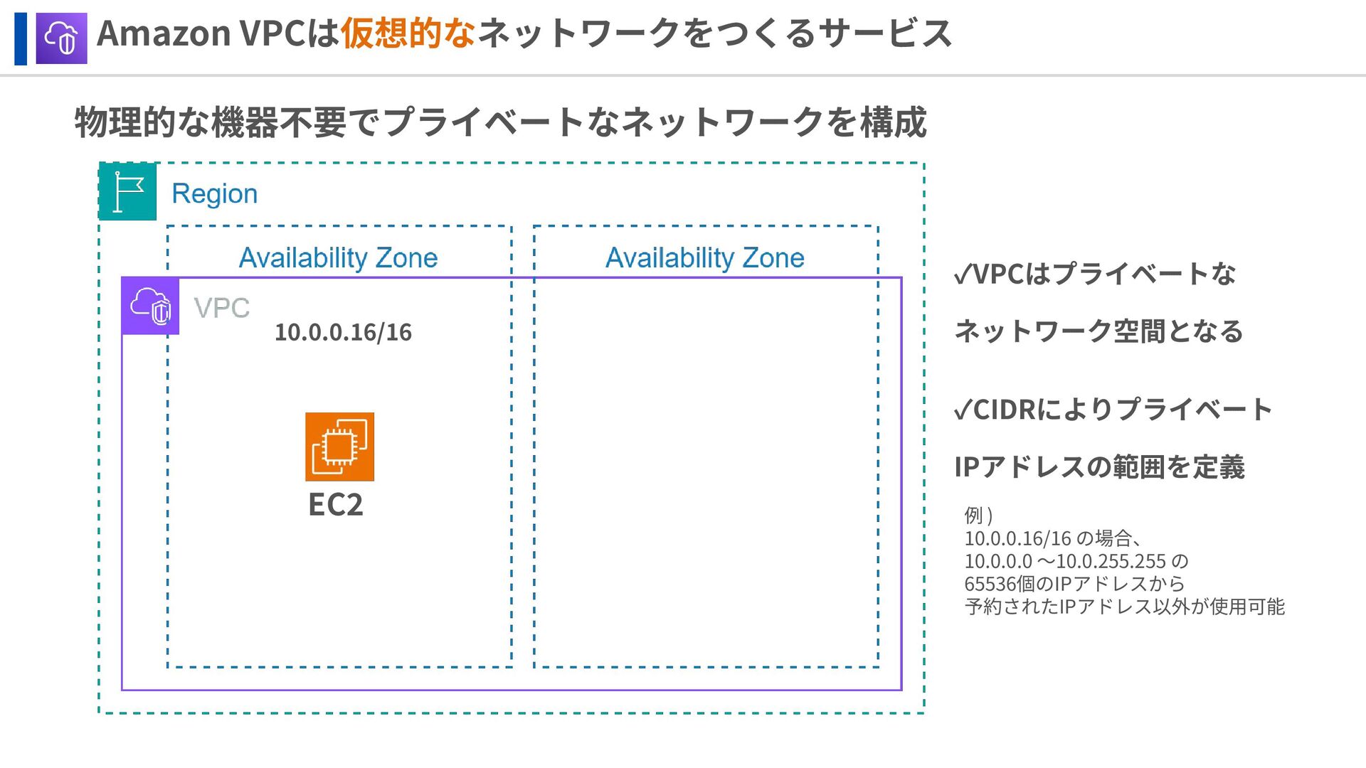 Amazon VPCは仮想的なネットワークをつくるサービス 物理的な機器不要でプライベートなネットワークを構成 EC2 ✓VPCはプライベートな ネットワーク空間となる 10.0.0.16/16 ✓CIDRによりプライベート IPアドレスの範囲を定義 例
