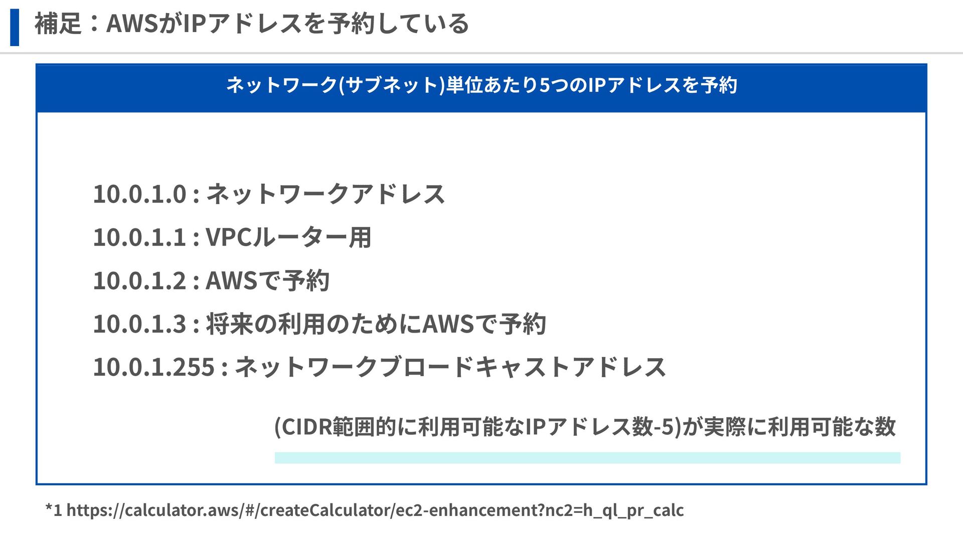 補⾜:AWSがIPアドレスを予約している ネットワーク(サブネット)単位あたり5つのIPアドレスを予約 *1 https://calculator.aws/#/createCalculator/ec2-enhancement?nc2=h_ql_pr_calc 10.0.1.0 : ネットワークアドレス 10.0.1.1 : VPCルーター⽤