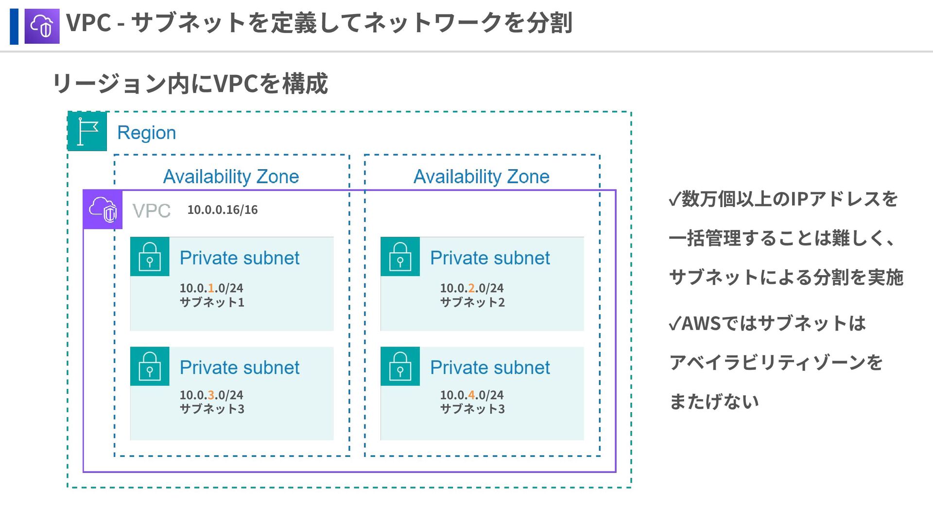 VPC - サブネットを定義してネットワークを分割 リージョン内にVPCを構成 10.0.0.16/16 10.0.1.0/24 サブネット1 10.0.3.0/24 サブネット3 10.0.2.0/24