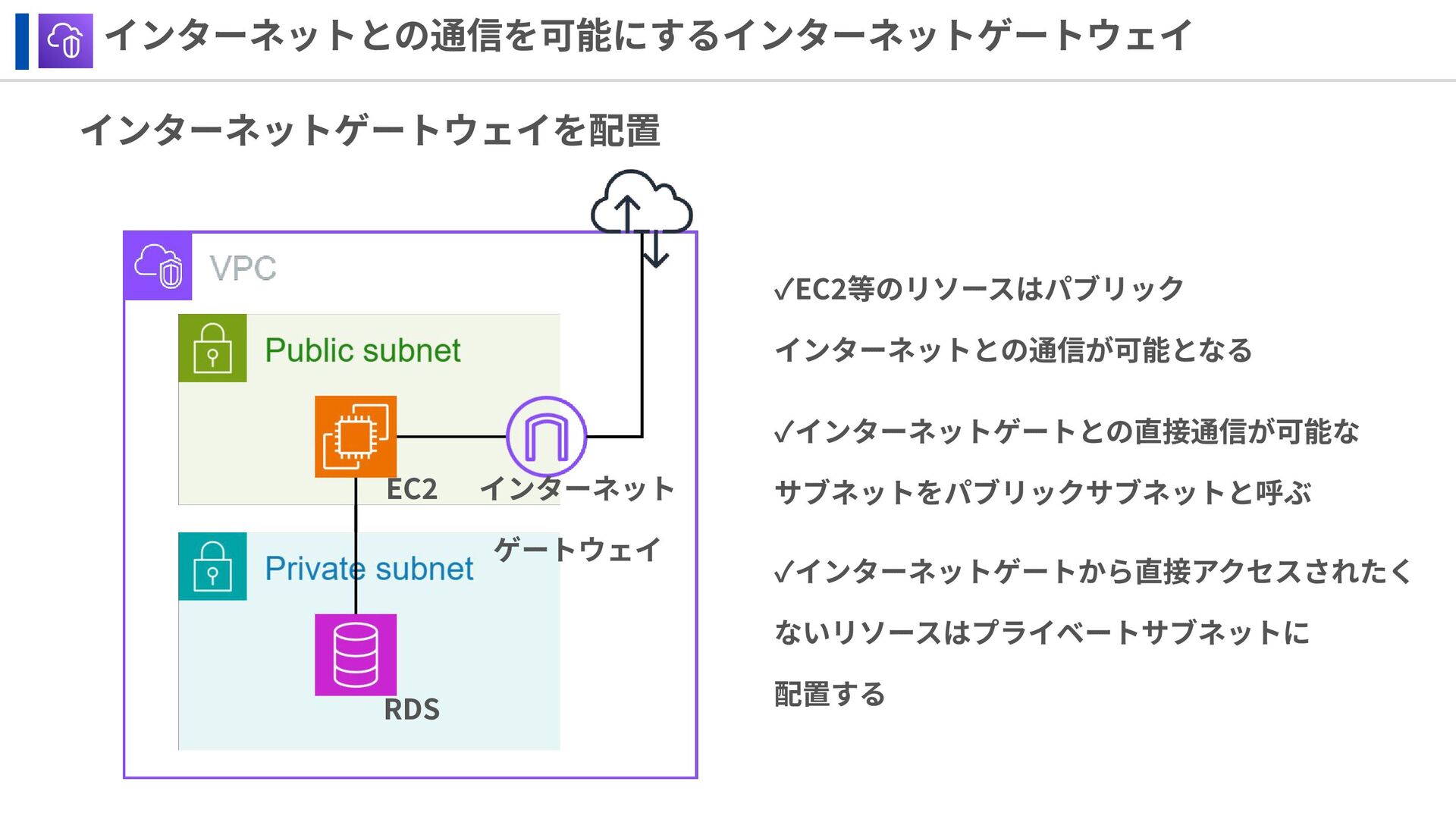 EC2 RDS インターネット ゲートウェイ インターネットとの通信を可能にするインターネットゲートウェイ インターネットゲートウェイを配置 ✓EC2等のリソースはパブリック インターネットとの通信が可能となる ✓インターネットゲートとの直接通信が可能な サブネットをパブリックサブネットと呼ぶ