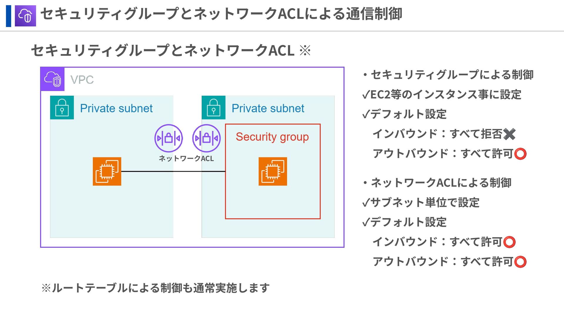 アウトバウンド:すべて許可⭕ セキュリティグループとネットワークACL ※ ※ルートテーブルによる制御も通常実施します ネットワークACL