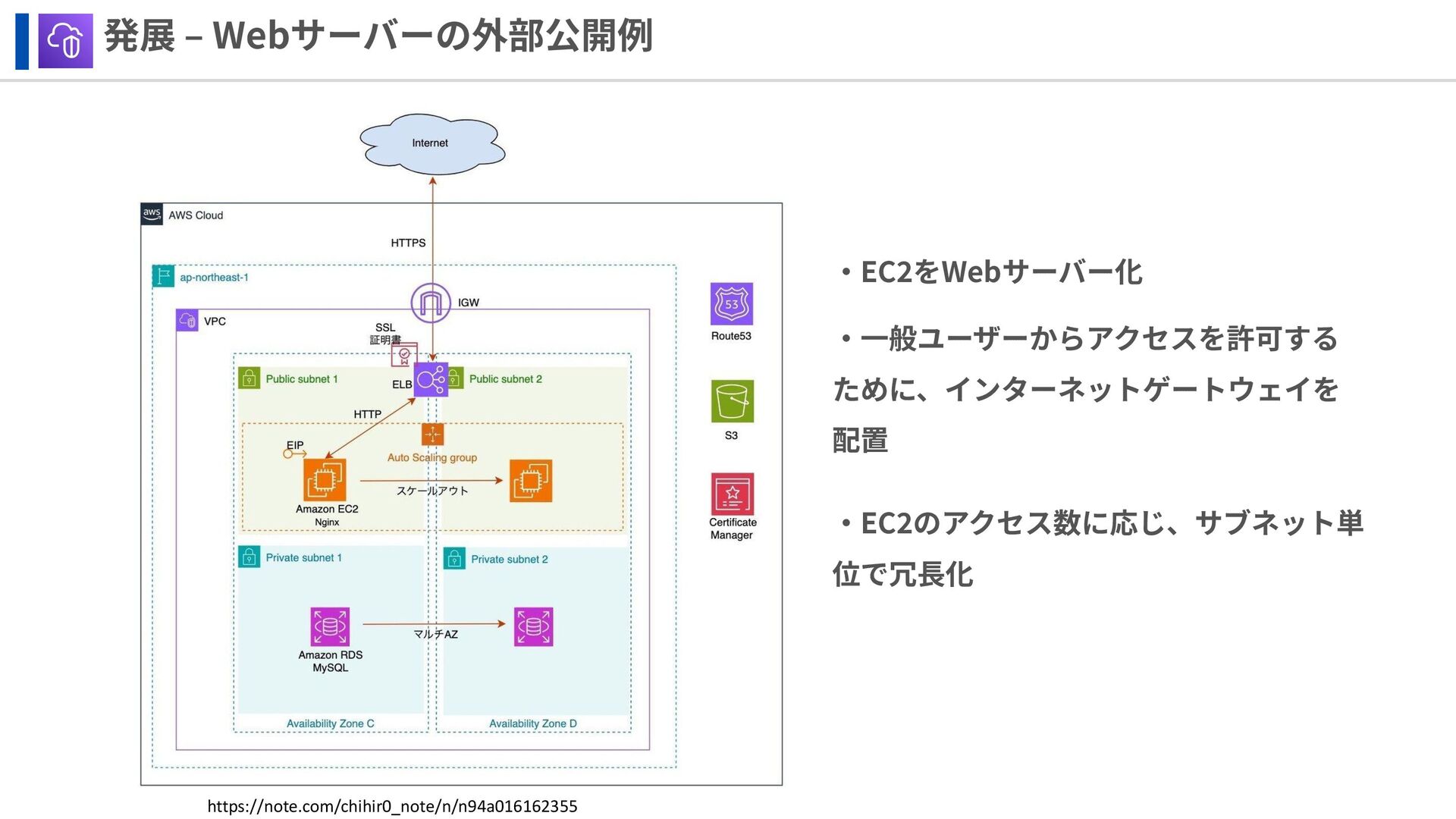 発展 ‒ Webサーバーの外部公開例 ‧EC2をWebサーバー化 ‧⼀般ユーザーからアクセスを許可する ために、インターネットゲートウェイを 配置 https://note.com/chihir0_note/n/n94a016162355 ‧EC2のアクセス数に応じ、サブネット単 位で冗⻑化