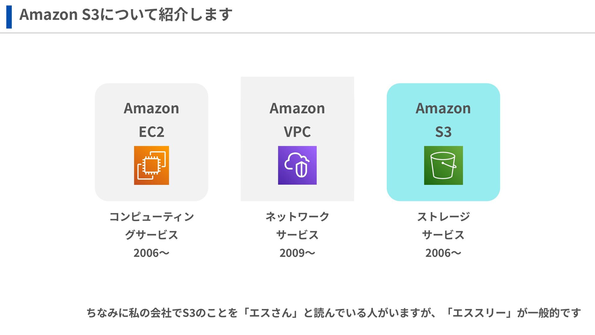 グサービス 2006〜 Amazon S3 ストレージ サービス 2006〜 ちなみに私の会社でS3のことを「エスさん」と読んでいる⼈がいますが、「エススリー」が⼀般的です