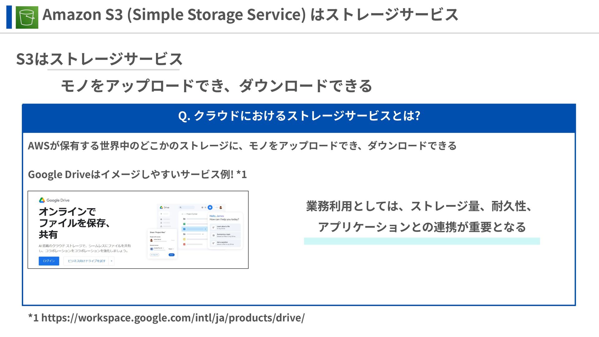 Storage Service) はストレージサービス Google Driveはイメージしやすいサービス例! *1 業務利⽤としては、ストレージ量、耐久性、 アプリケーションとの連携が重要となる