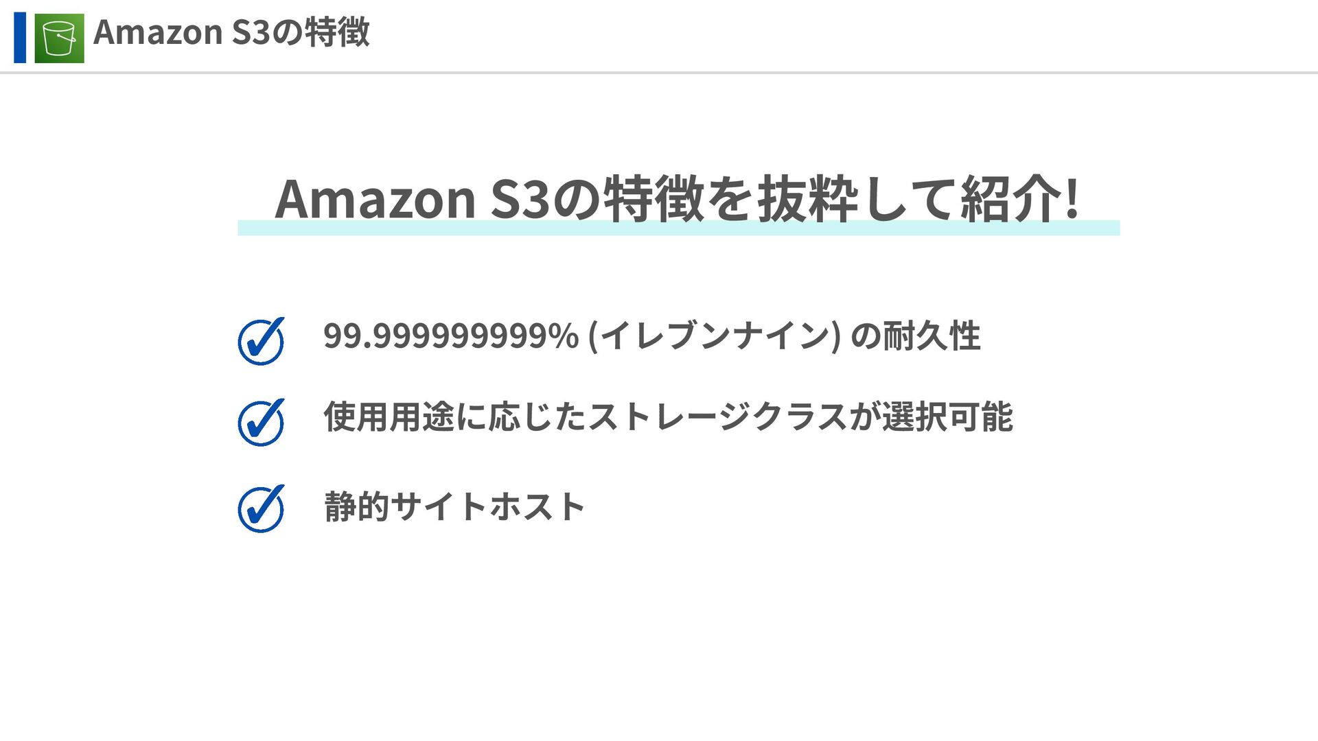 Amazon S3の特徴 Amazon S3の特徴を抜粋して紹介! 99.999999999% (イレブンナイン) の耐久性 使⽤⽤途に応じたストレージクラスが選択可能 静的サイトホスト
