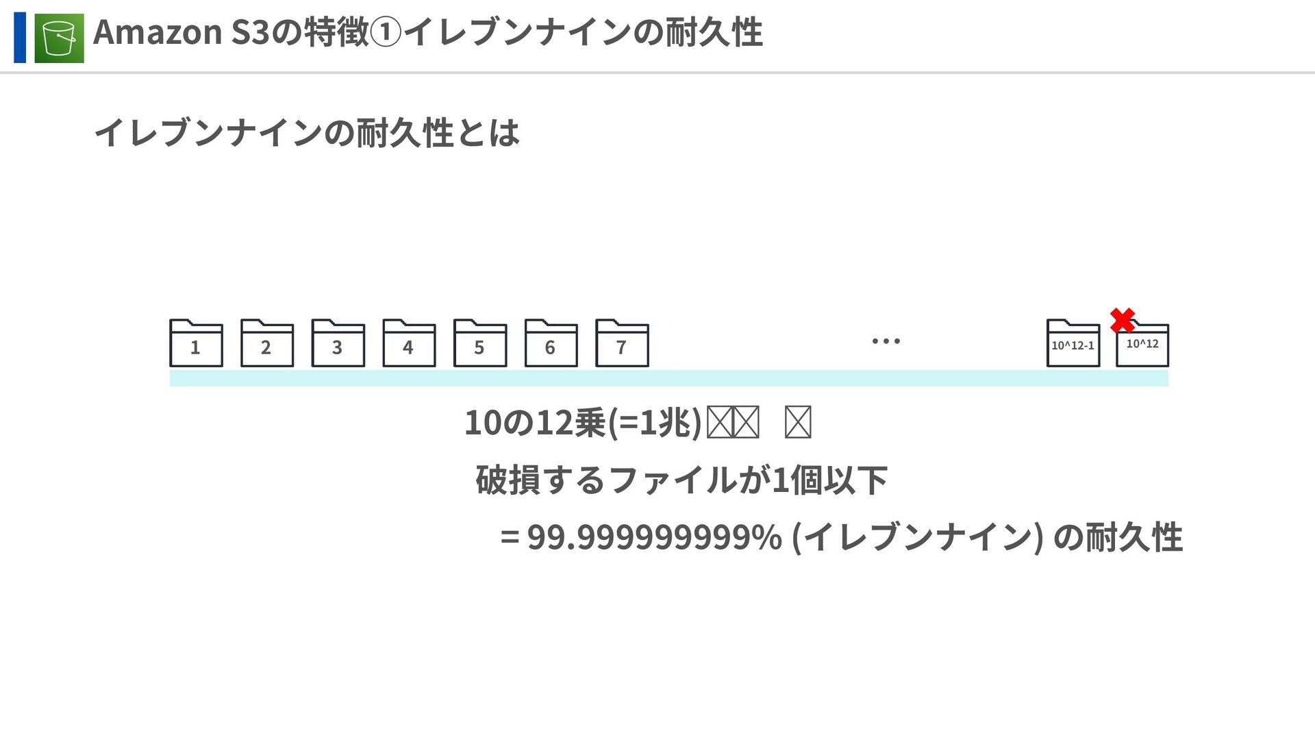 Amazon S3の特徴①イレブンナインの耐久性 イレブンナインの耐久性とは 10の12乗(=1兆)個のファイル 破損するファイルが1個以下 = 99.999999999% (イレブンナイン) の耐久性 …