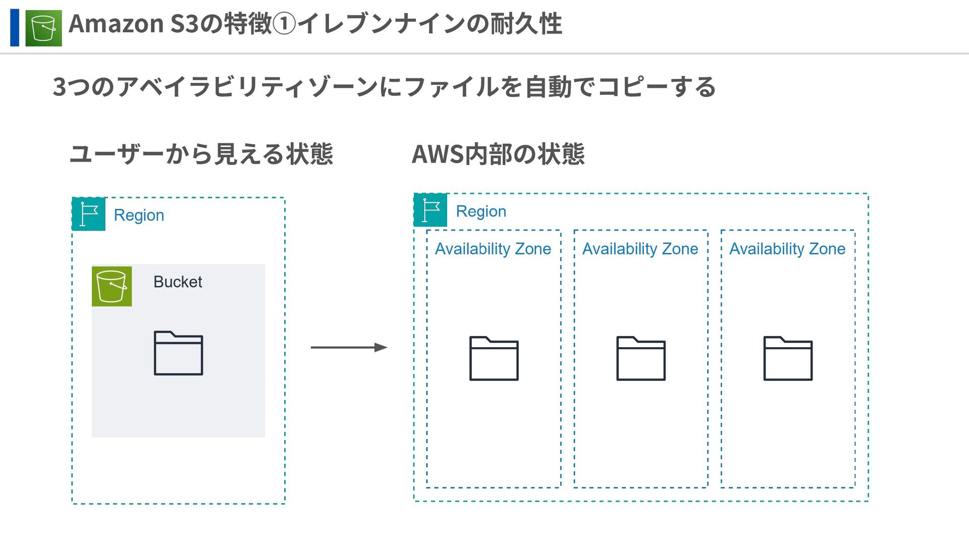 Amazon S3の特徴①イレブンナインの耐久性 3つのアベイラビリティゾーンにファイルを⾃動でコピーする ユーザーから⾒える状態 AWS内部の状態