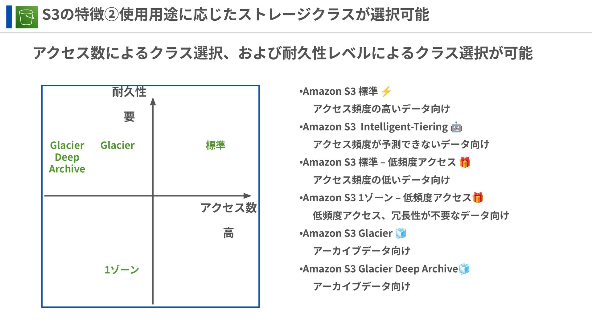 S3の特徴②使⽤⽤途に応じたストレージクラスが選択可能 アクセス数によるクラス選択、および耐久性レベルによるクラス選択が可能 •Amazon S3 標準 ⚡ アクセス頻度の⾼いデータ向け •Amazon S3 Intelligent-Tiering