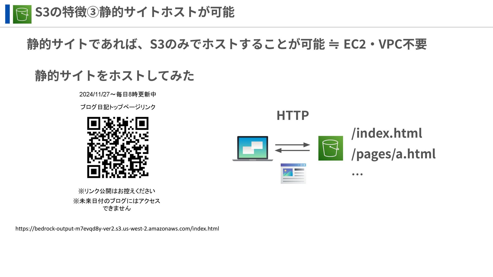 S3の特徴③静的サイトホストが可能 静的サイトであれば、S3のみでホストすることが可能 ≒ EC2‧VPC不要 /index.html /pages/a.html … HTTP 2024/11/27~毎日8時更新中 ※リンク公開はお控えください