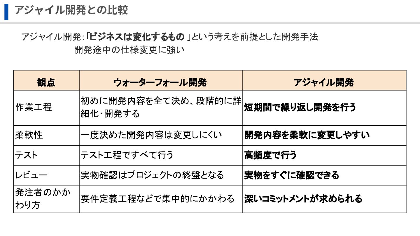 細化・開発する 短期間で繰り返し開発を行う 柔軟性 一度決めた開発内容は変更しにくい 開発内容を柔軟に変更しやすい テスト テスト工程ですべて行う 高頻度で行う レビュー 実物確認はプロジェクトの終盤となる 実物をすぐに確認できる 発注者のかか わり方 要件定義工程などで集中的にかかわる 深いコミットメントが求められる