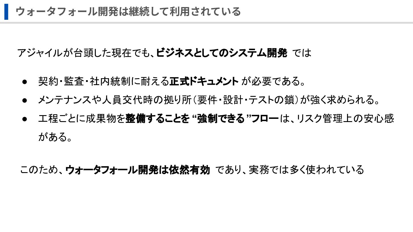 “強制できる ”フローは、リスク管理上の安心感 がある。 このため、ウォータフォール開発は依然有効 であり、実務では多く使われている