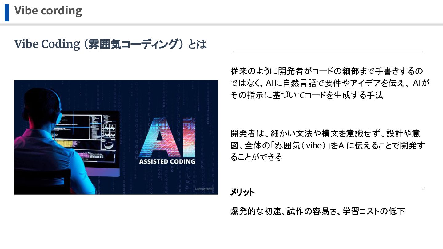 開発者は、細かい文法や構文を意識せず、設計や意 図、全体の「雰囲気( vibe)」をAIに伝えることで開発す ることができる メリット 爆発的な初速、試作の容易さ、学習コストの低下