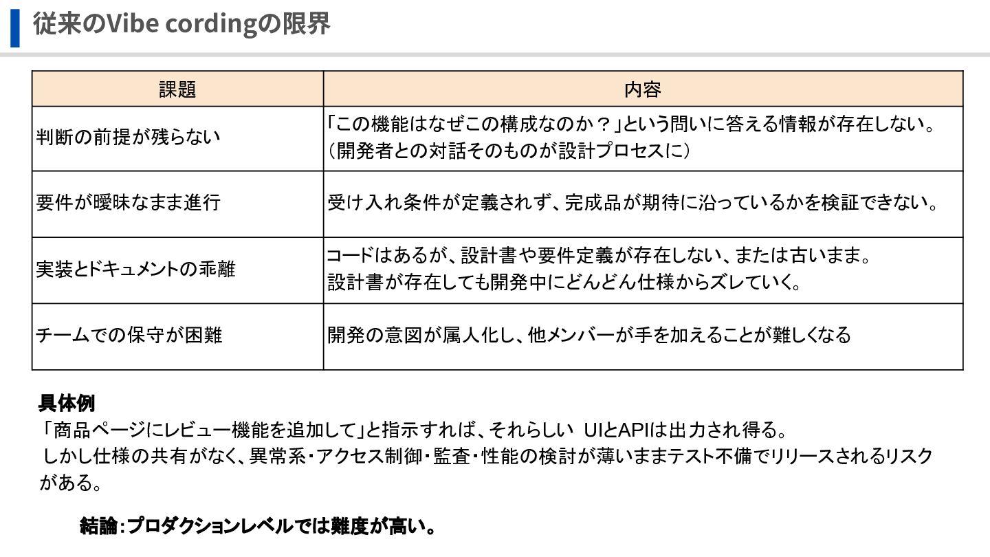 従来のVibe cordingの限界 課題 内容 判断の前提が残らない 「この機能はなぜこの構成なのか?」という問いに答える情報が存在しない。 (開発者との対話そのものが設計プロセスに) 要件が曖昧なまま進行 受け入れ条件が定義されず、完成品が期待に沿っているかを検証できない。 実装とドキュメントの乖離