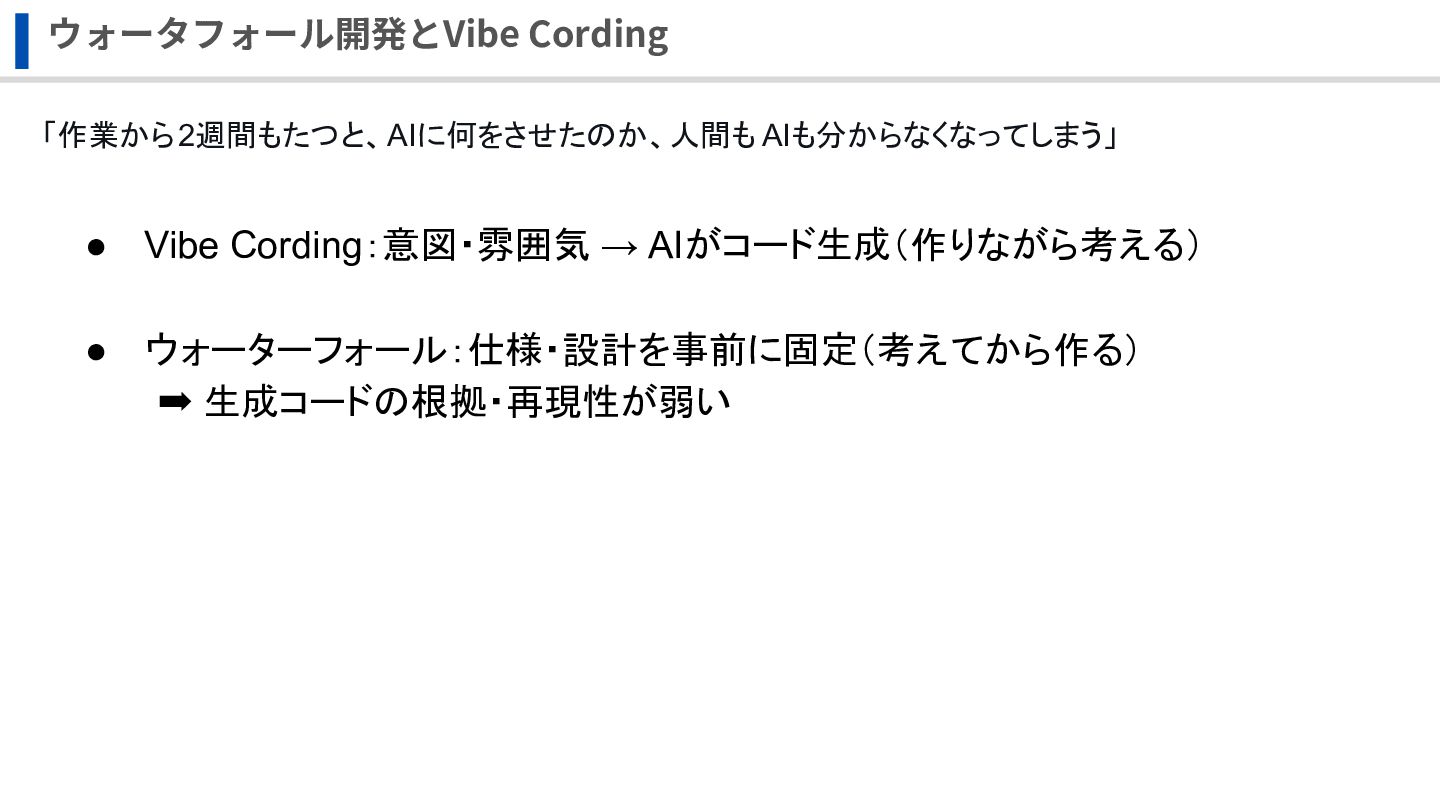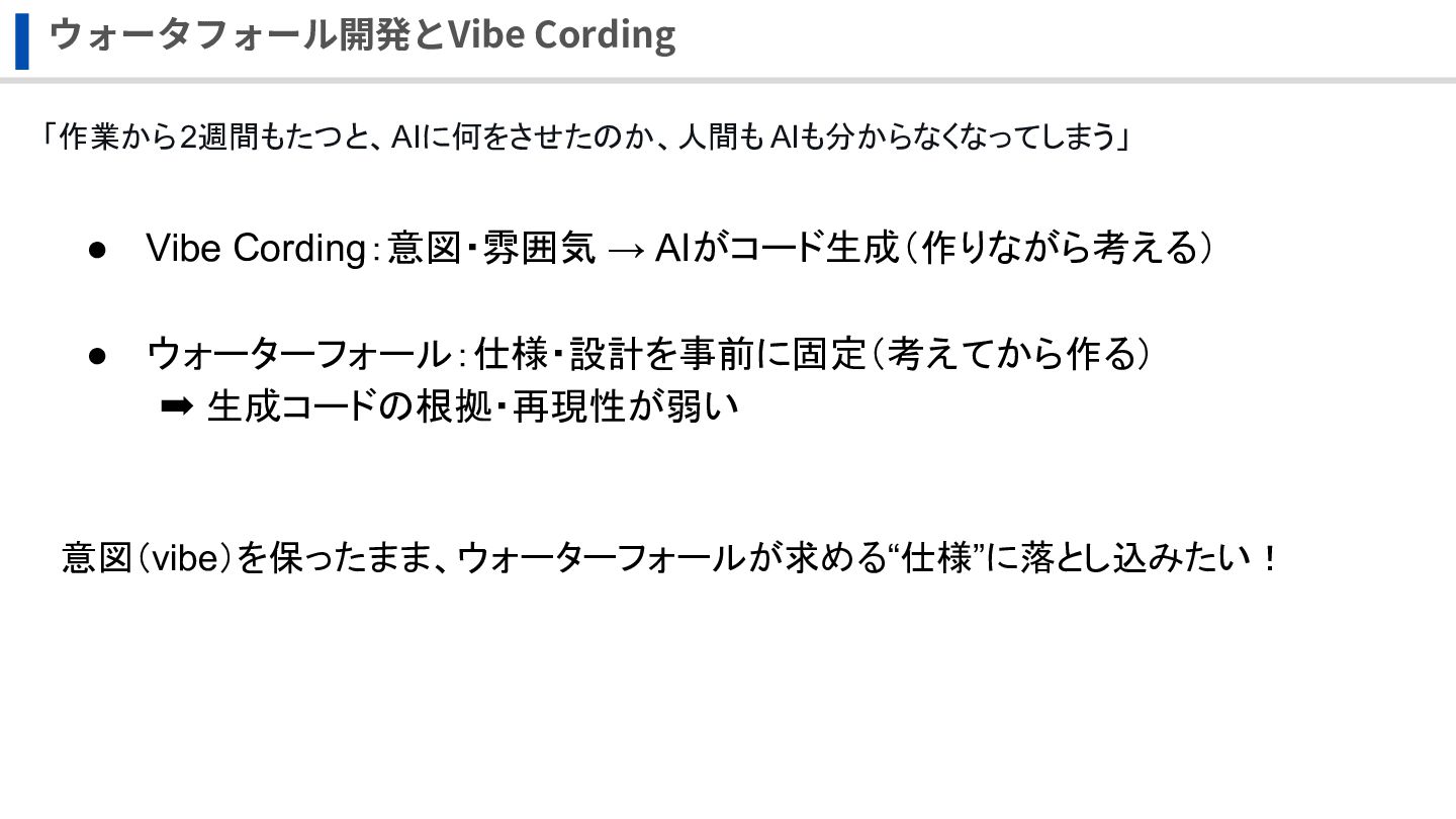 ウォーターフォール:仕様・設計を事前に固定(考えてから作る) ➡ 生成コードの根拠・再現性が弱い 意図(vibe)を保ったまま、ウォーターフォールが求める“仕様”に落とし込みたい!