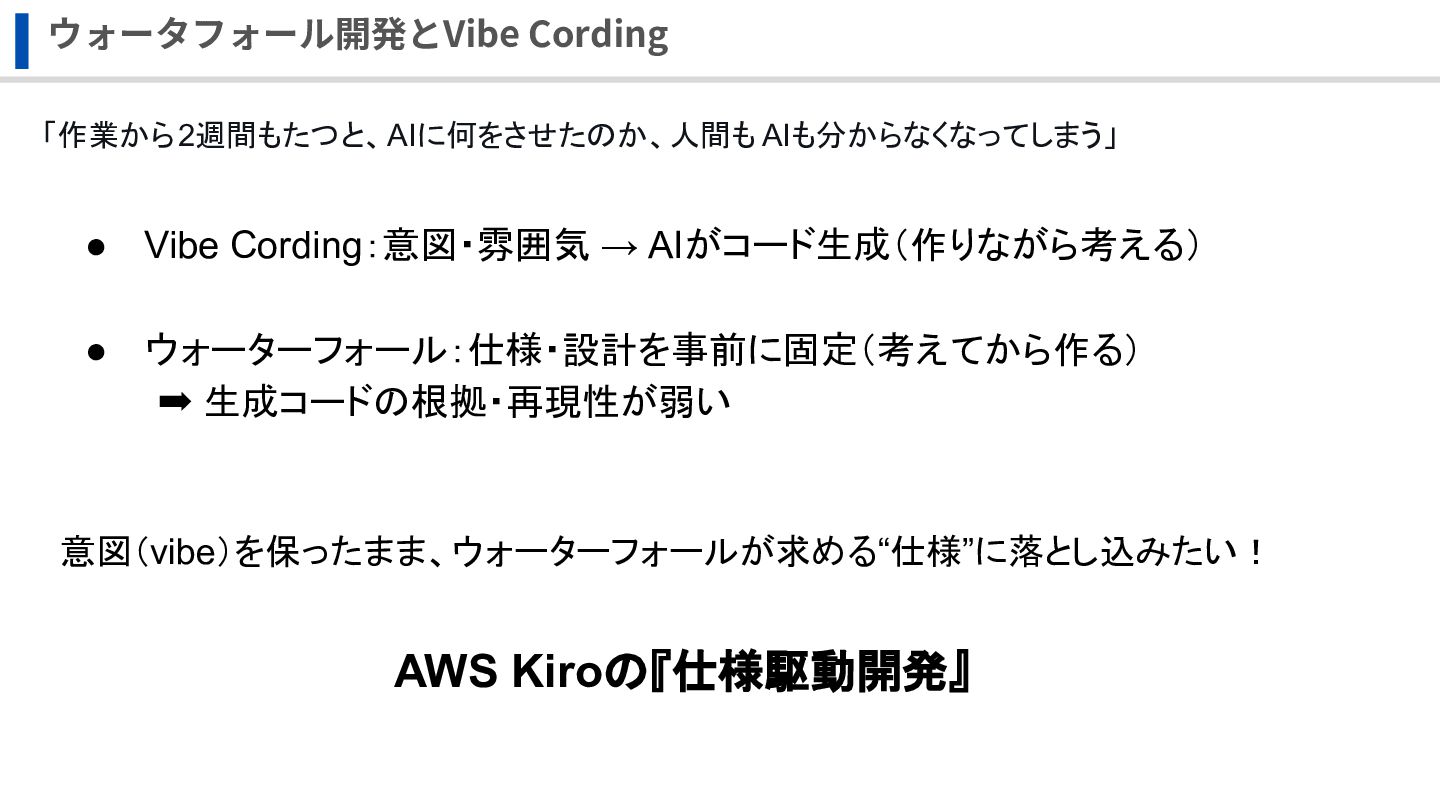 ウォーターフォール:仕様・設計を事前に固定(考えてから作る) ➡ 生成コードの根拠・再現性が弱い 意図(vibe)を保ったまま、ウォーターフォールが求める“仕様”に落とし込みたい! AWS Kiroの『仕様駆動開発』