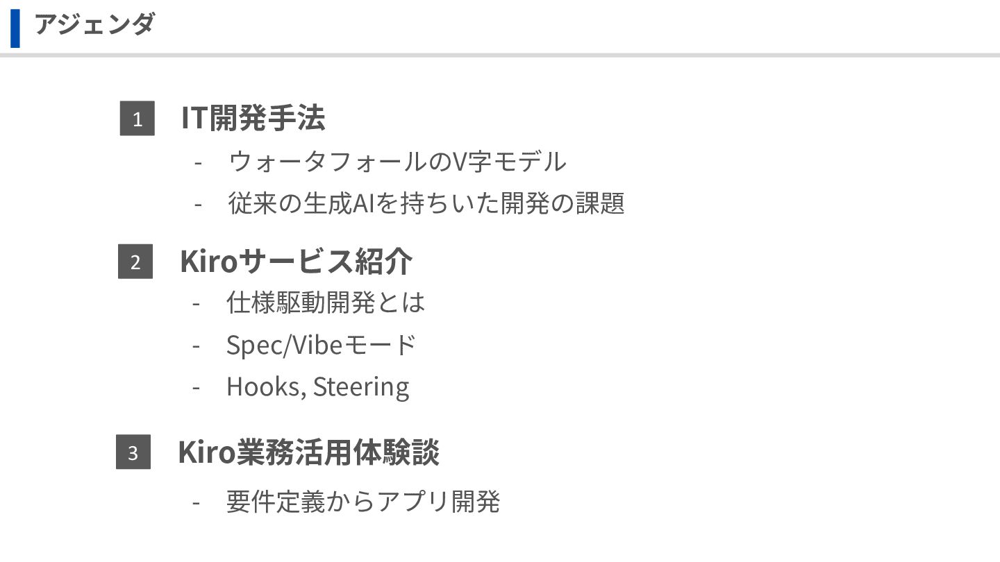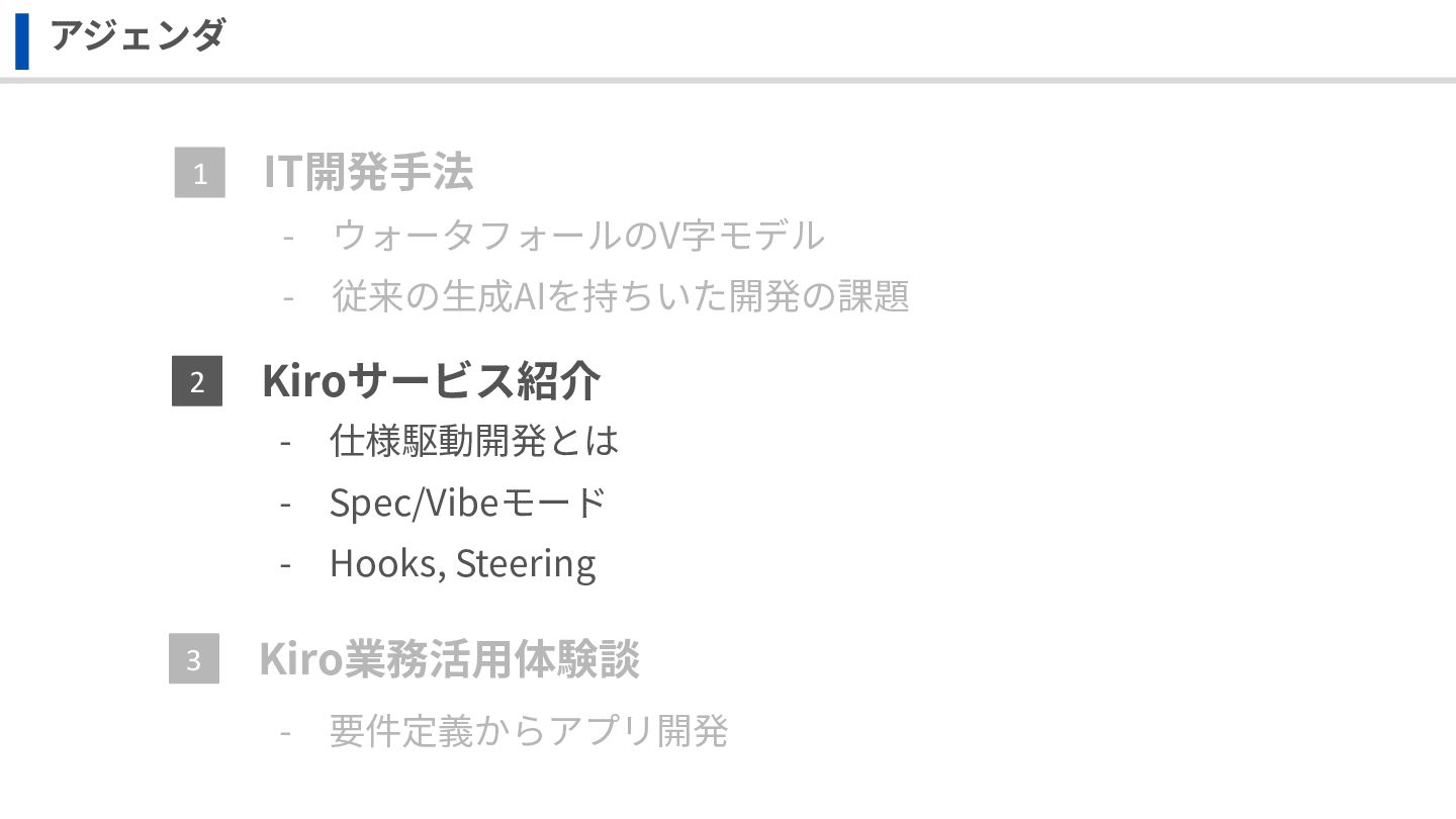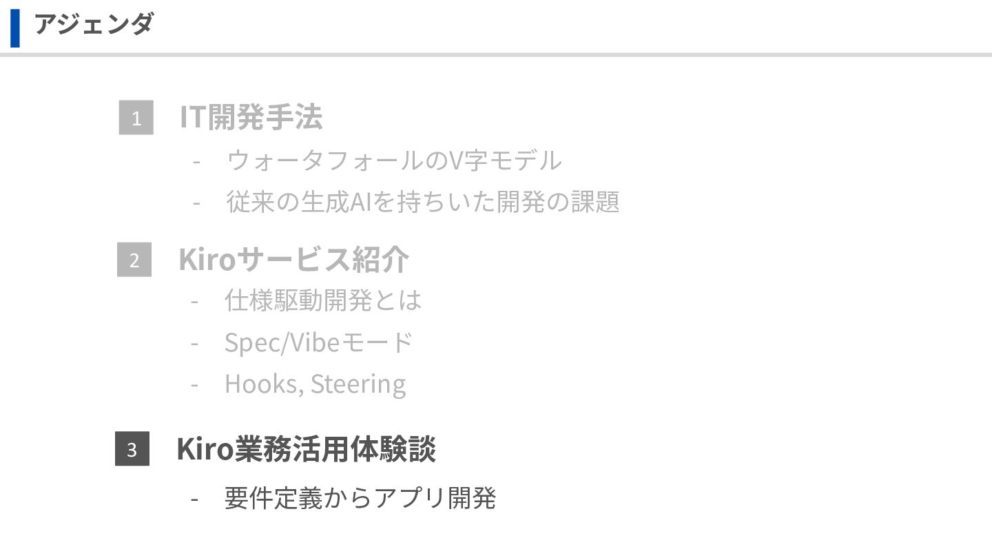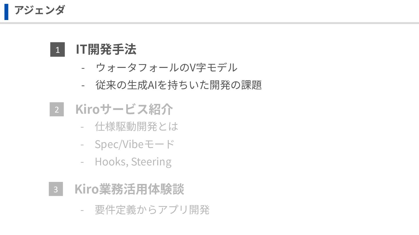 IT開発⼿法 Kiro業務活⽤体験談 アジェンダ 1 3 Kiroサービス紹介 2 - ウォータフォールのV字モデル -