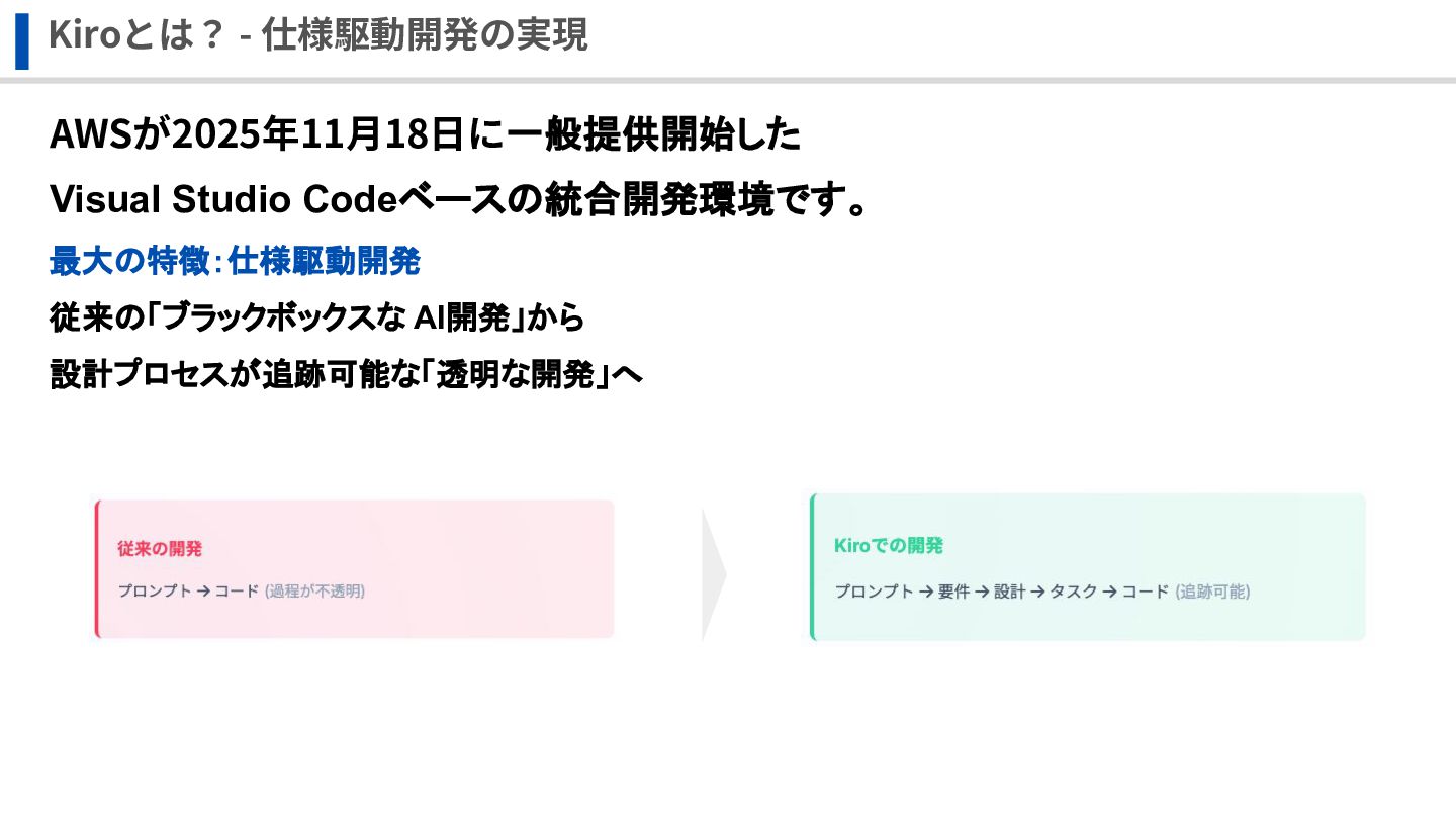 Kiroとは? - 仕様駆動開発の実現 AWSが2025年11⽉18⽇に一般提供開始した Visual Studio Codeベースの統合開発環境です。 最大の特徴:仕様駆動開発 従来の「ブラックボックスな AI開発」から